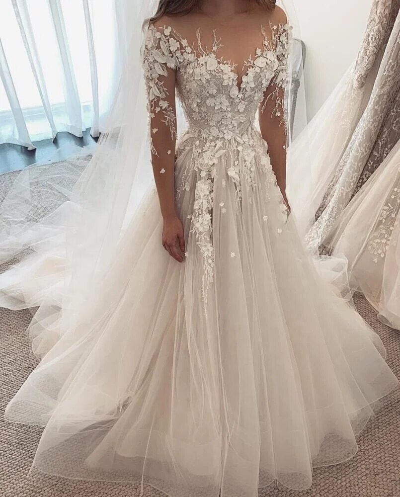 White/Ivory Lace 3D Applique Wedding Dresses Long Sleeve Bridal Gown Sweep Train