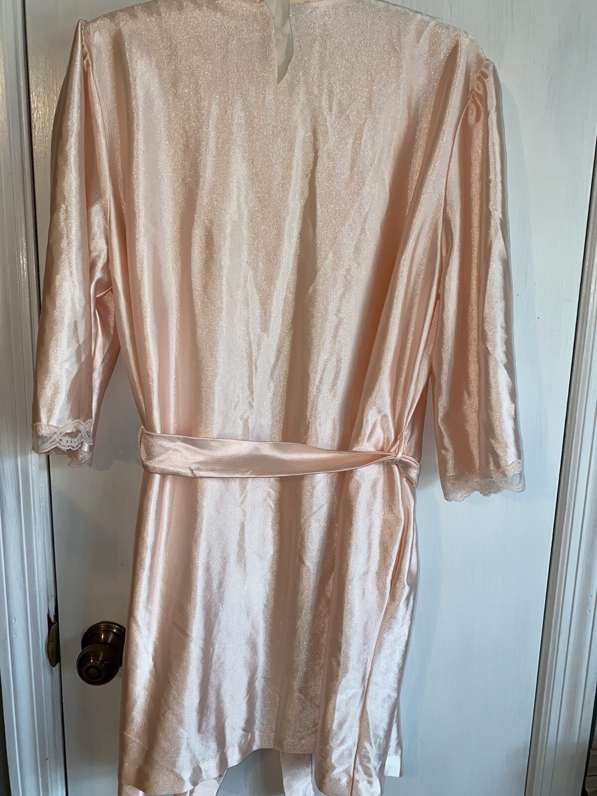 как выглядит Lorraine Large vintage pink robe lace trimmed attached belt short Polyester фото