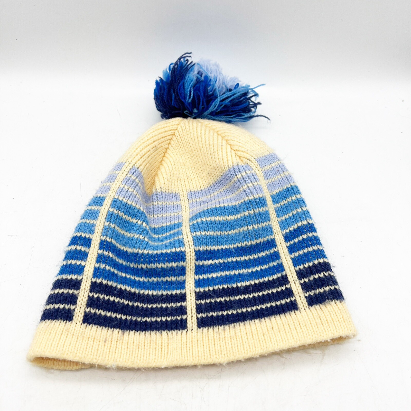 VTG Wigwam Winter Snow Hat Ivory Blue Acrylic Pompom Unisex USA Made Stripe Geo