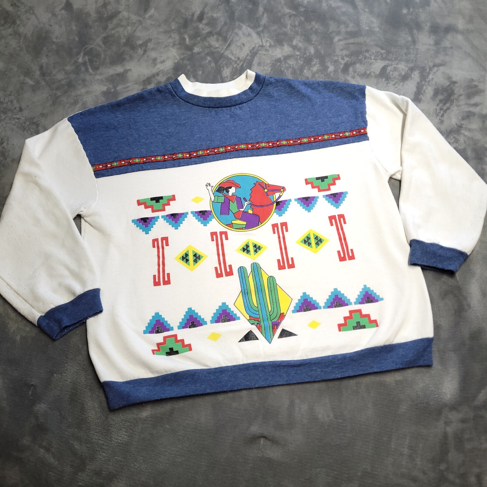 Vtg 90s Aztec Cowgirl Horse Equestrian Large Ringer Crewneck Sweatshirt Made USA