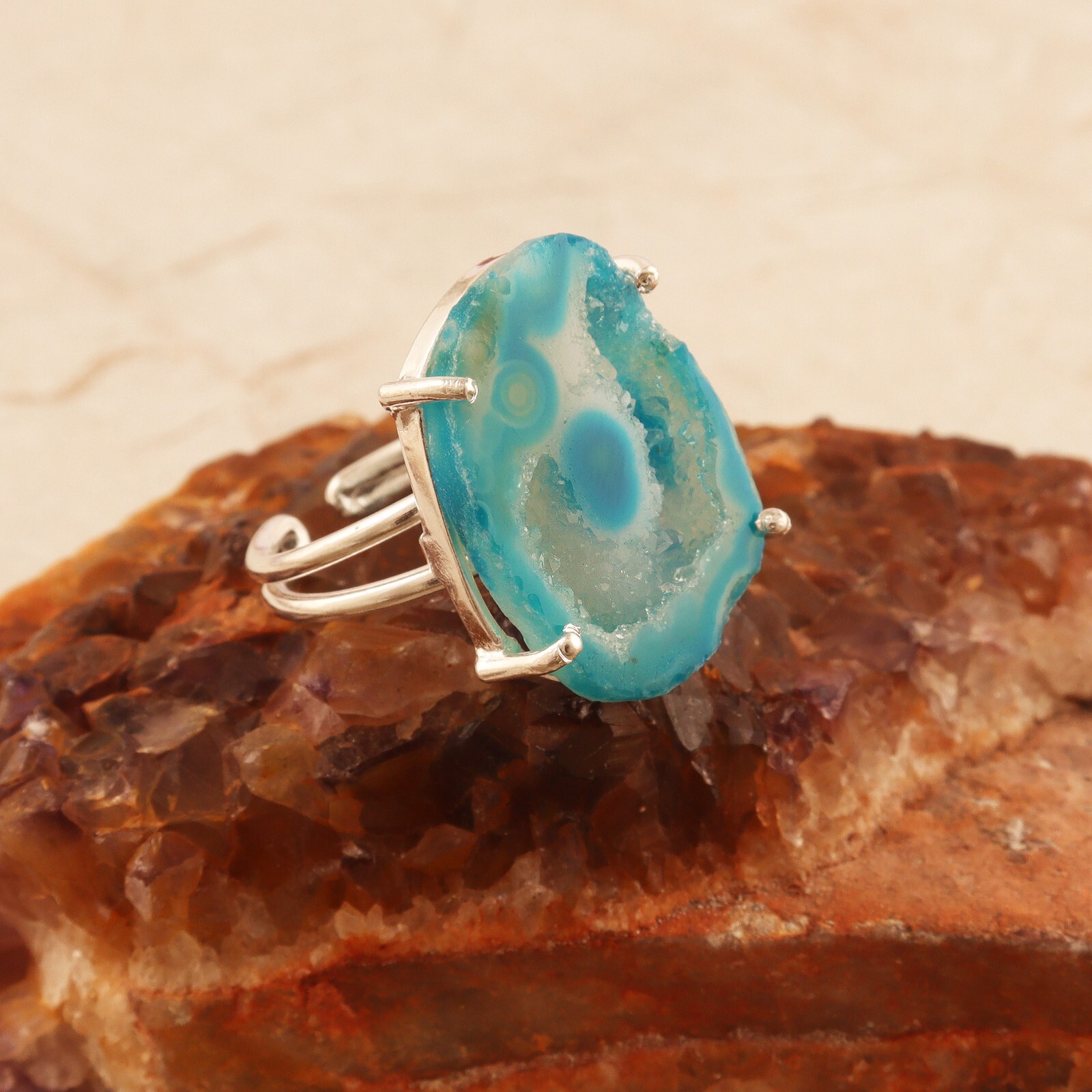 Double Layer Gemstone Ring Geode Druzy Silver Plated Prong Set Adjustable Ring