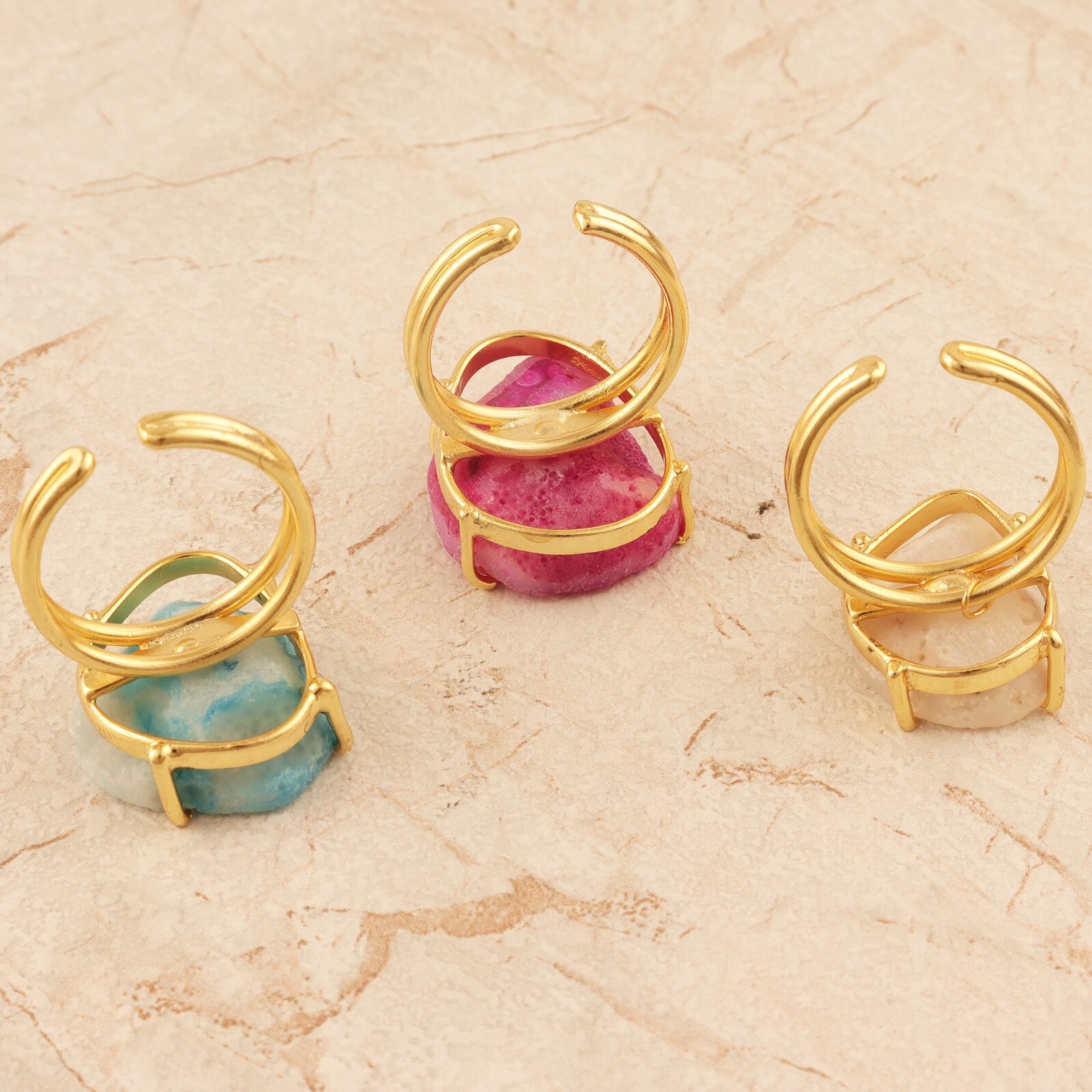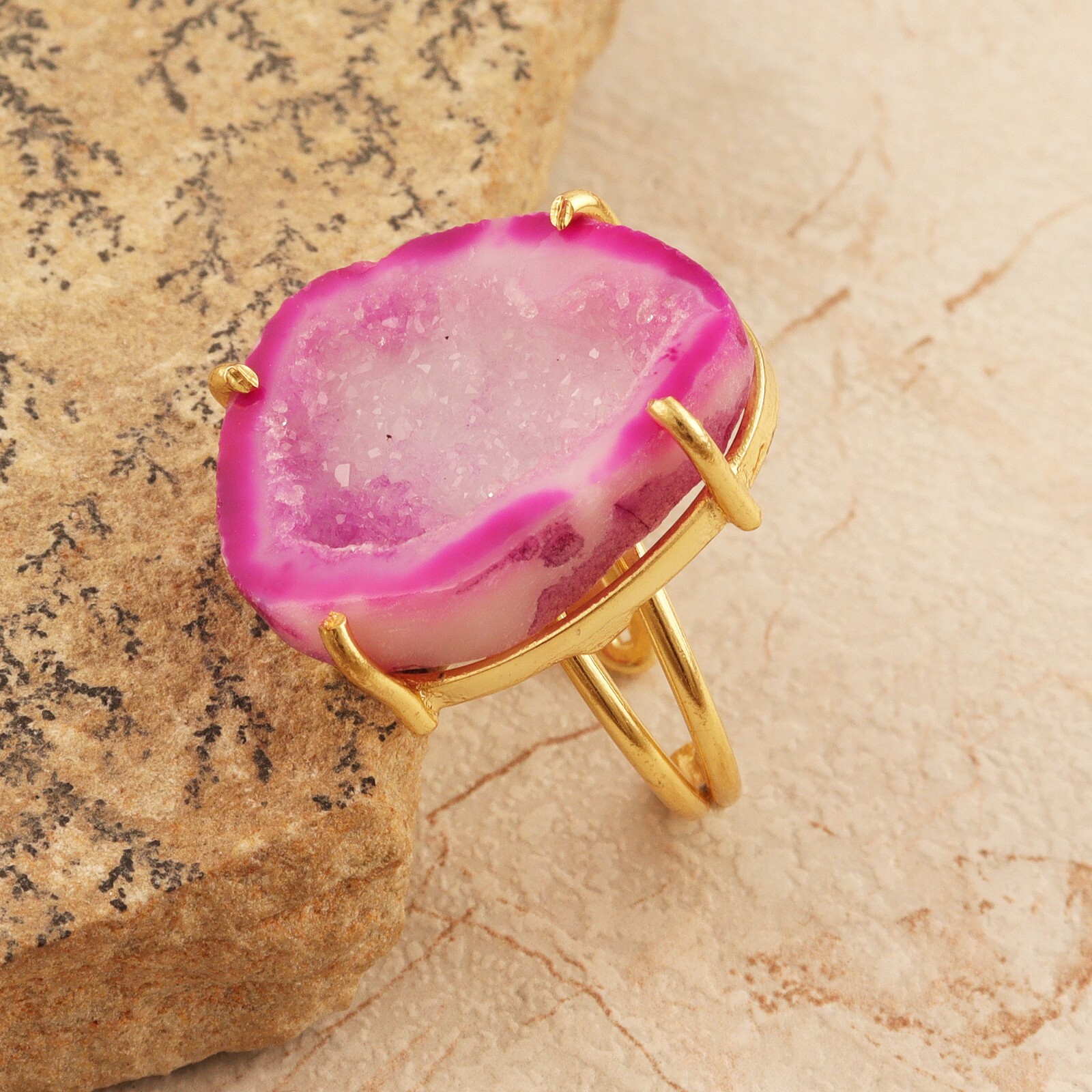 Natural Double Layer Ring Pink Geode Druzy Gold Plated Statement Adjustable Ring