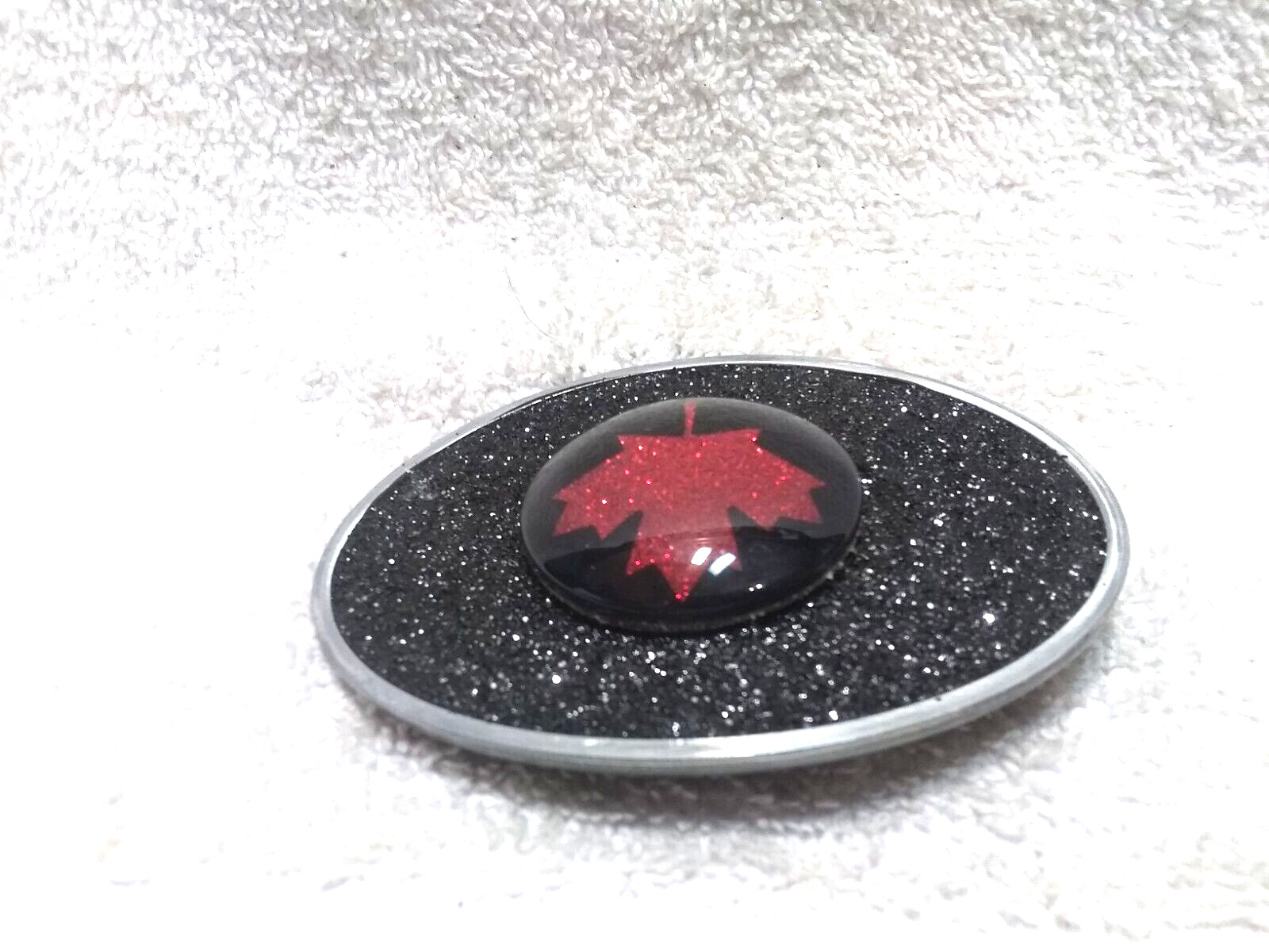 Red Flower Weed Leaf In Raised Bubble Black Sparkle Oval Buckle Great Shape
