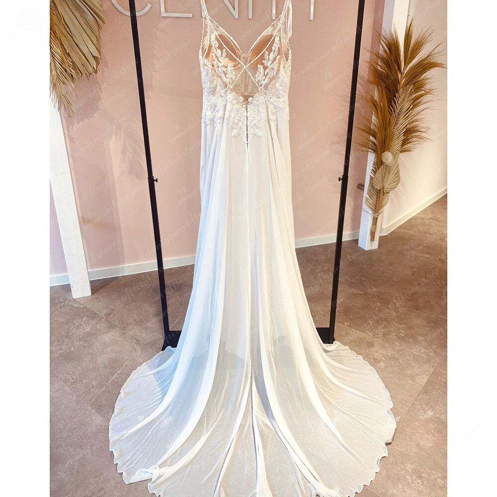 Boho Chiffon Spaghetti Straps Wedding Dress V Neck Backless Bridal Gown Applqiue