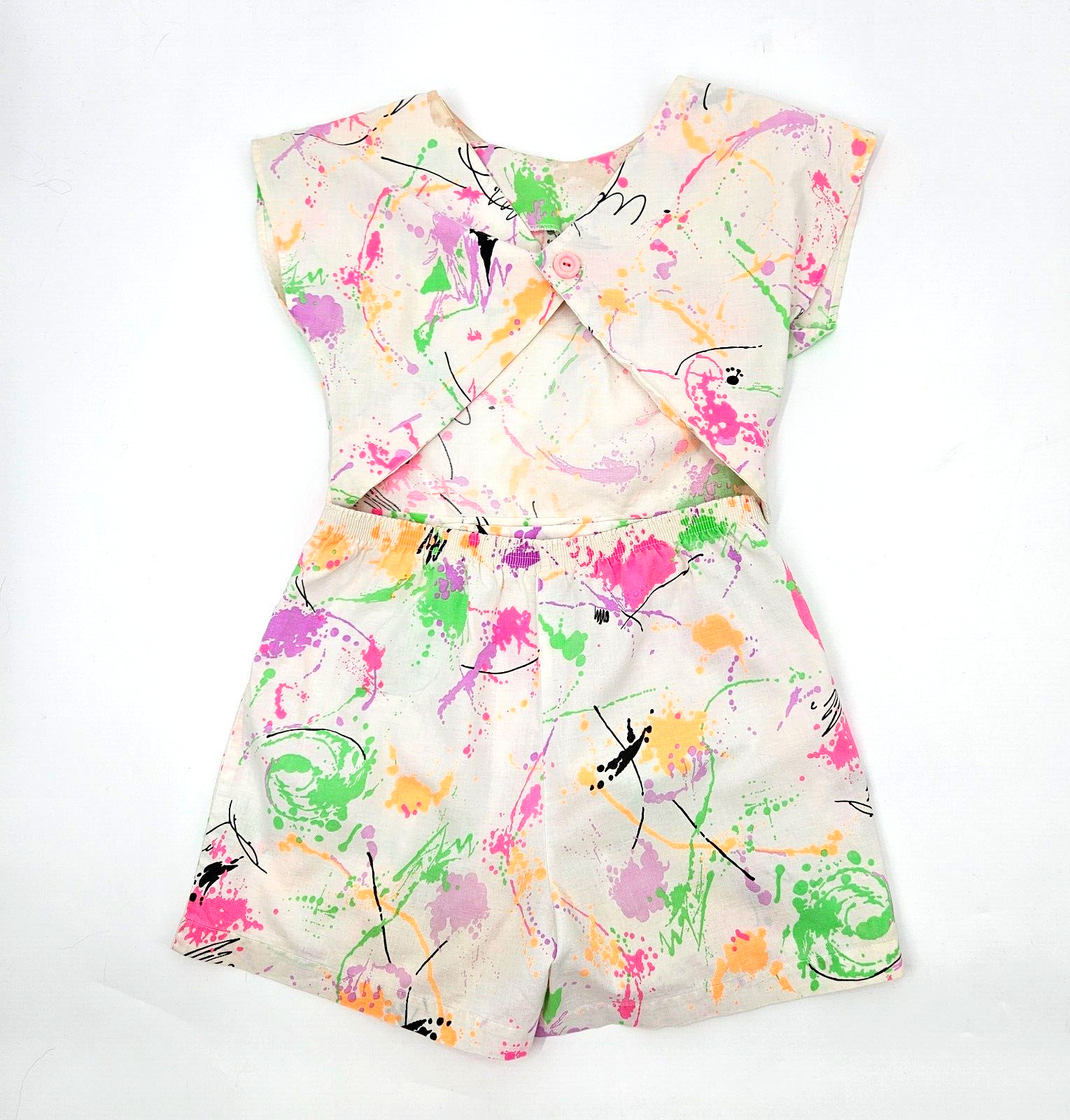 Vintage SWEET EAST Girl's 2 Piece Outfit Neon Paint Splatter Shorts Top Button