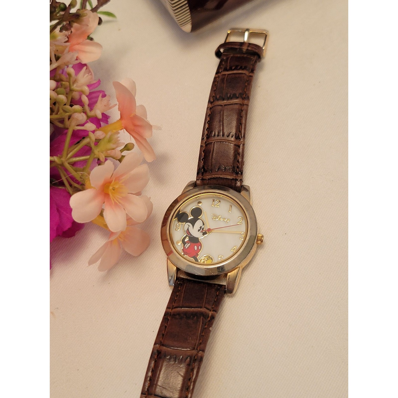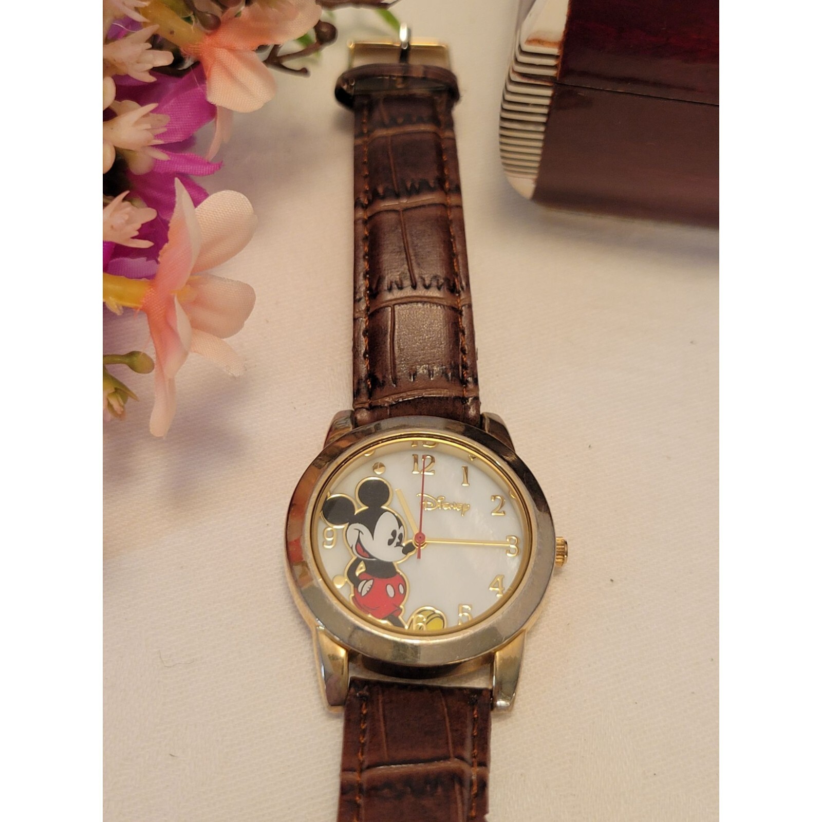 Vntg Disney Mickey Mouse Accutime Watch Brown Leather Strap Gold-Tone Stainless