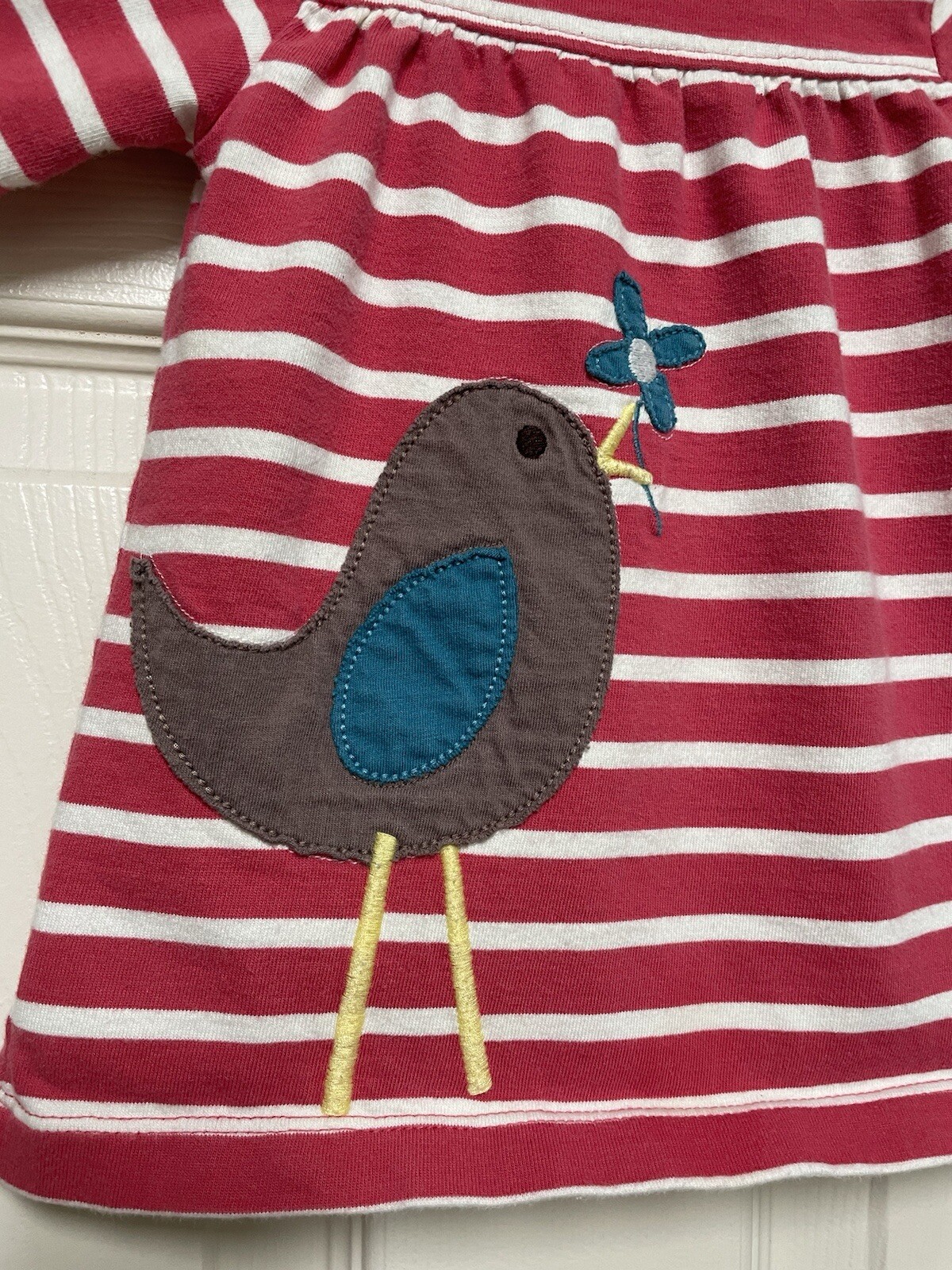 как выглядит Baby Boden Bird Appliqu Long Sleeve Pink White Stripe Dress Size 0-3 Months фото