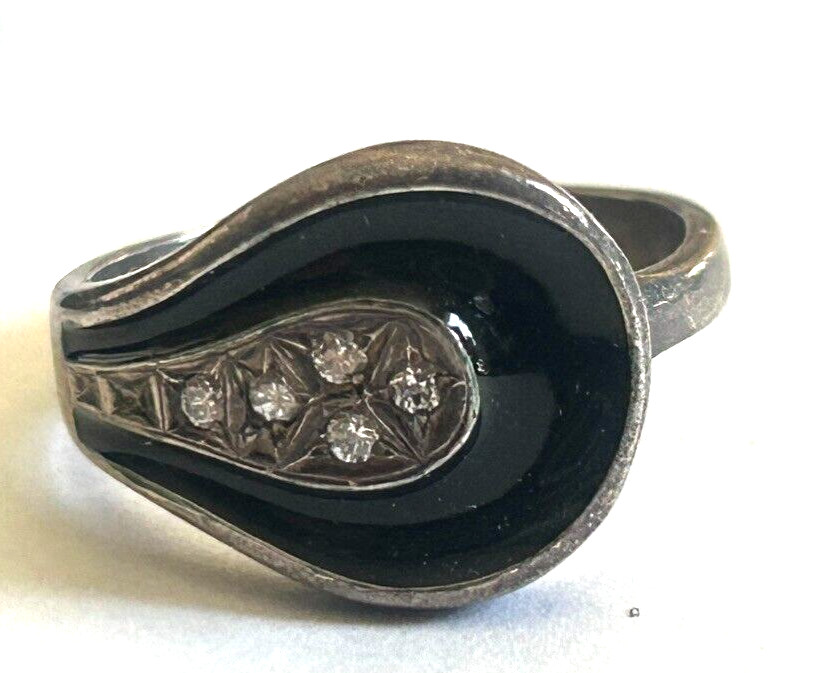 VTG Sterling Silver .925 Handmade w/Black Enamel 5 Crystals Women Ring Sz.6.5
