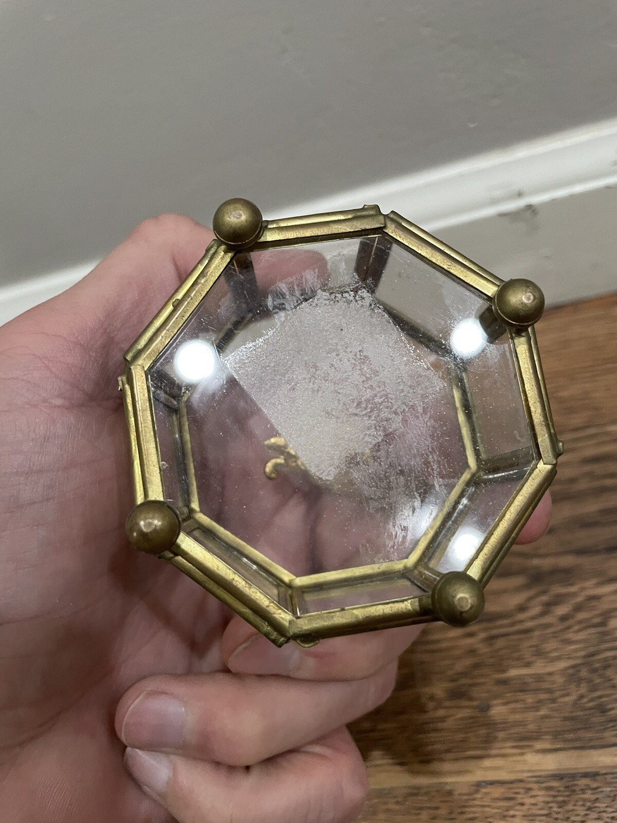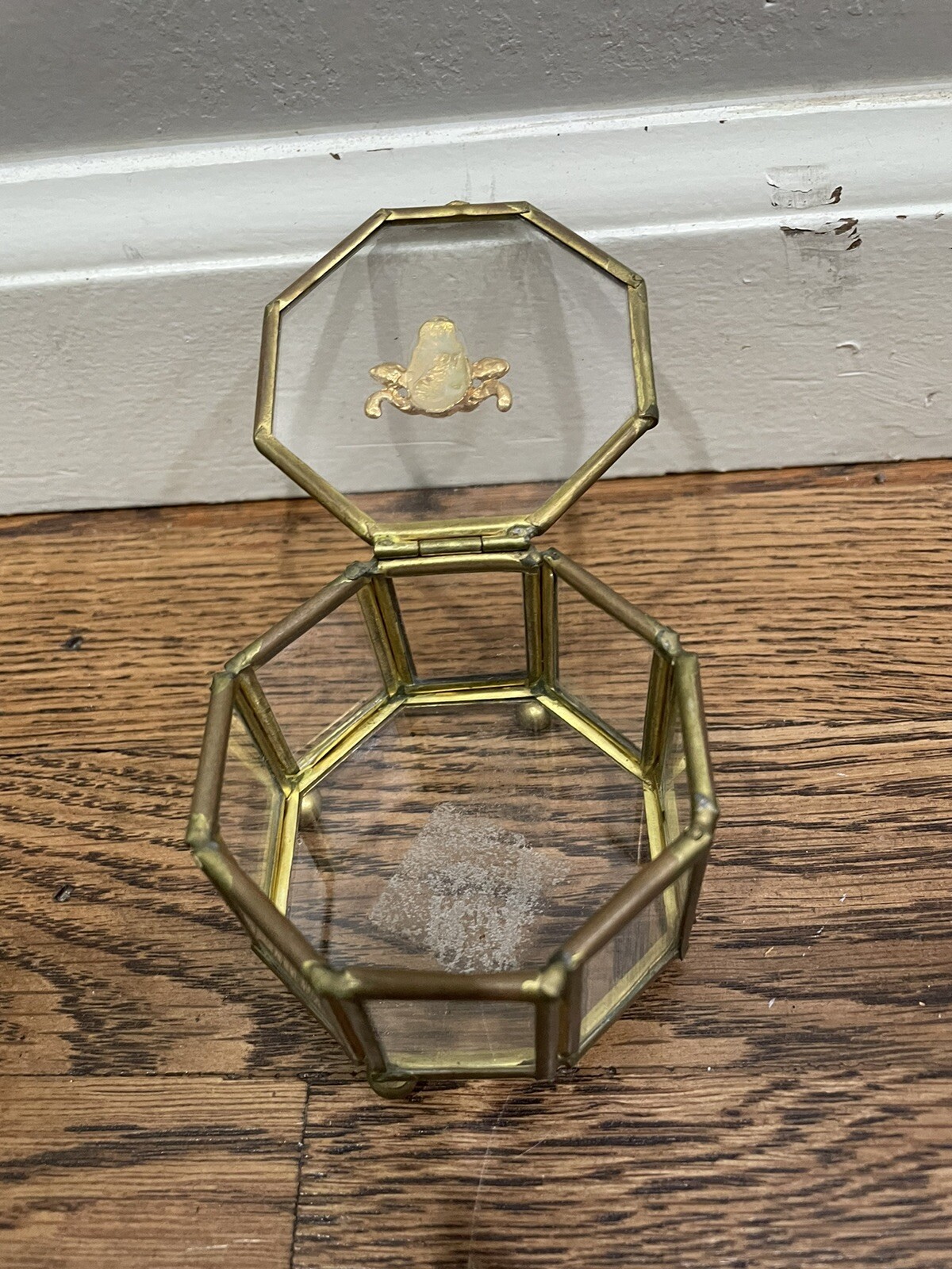 как выглядит Vintage Paneled Glass and Footed Hexagon Brass Trinket Jewelry Box NL фото