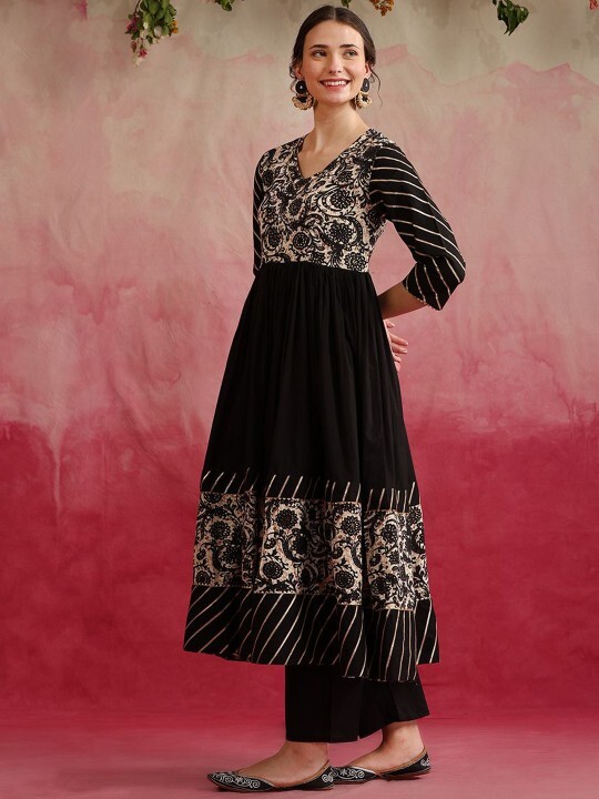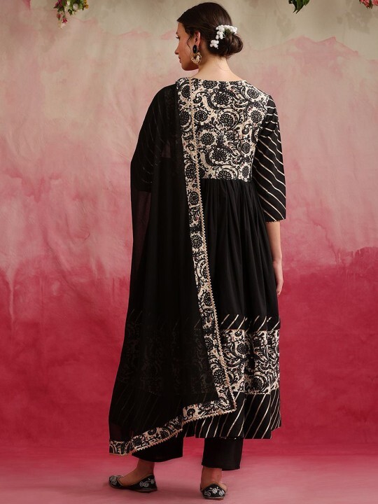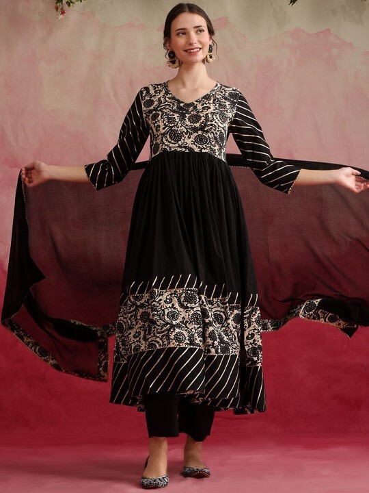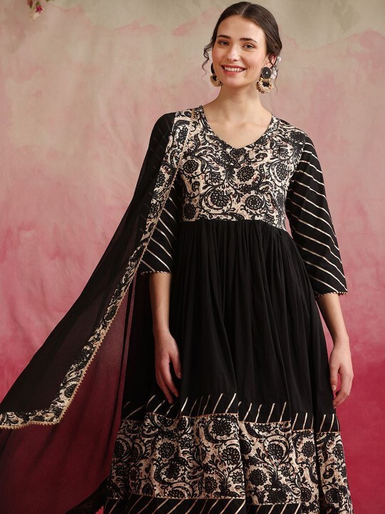 как выглядит Women Floral Yoke Design V-Neck Anarkali Kurta with Palazzos Dupatta Set фото