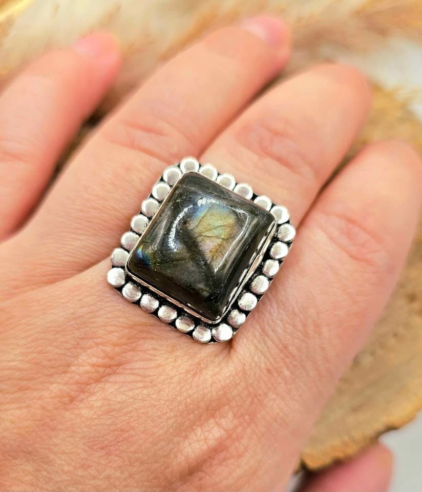 Nature Labradorite Flashy Square 925 Shape Ring Size 10