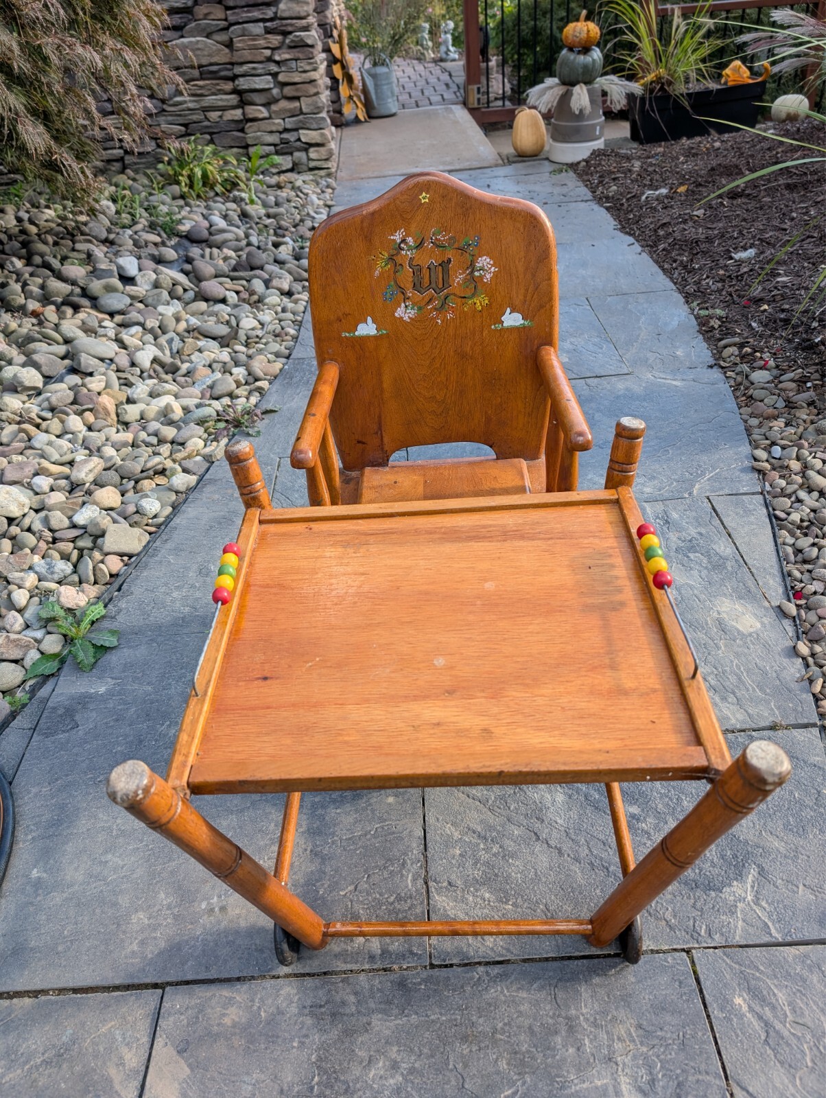 • Antique Wood Highchair Child's Wooden Booster Seat Hand Crafted Kid's High Chair