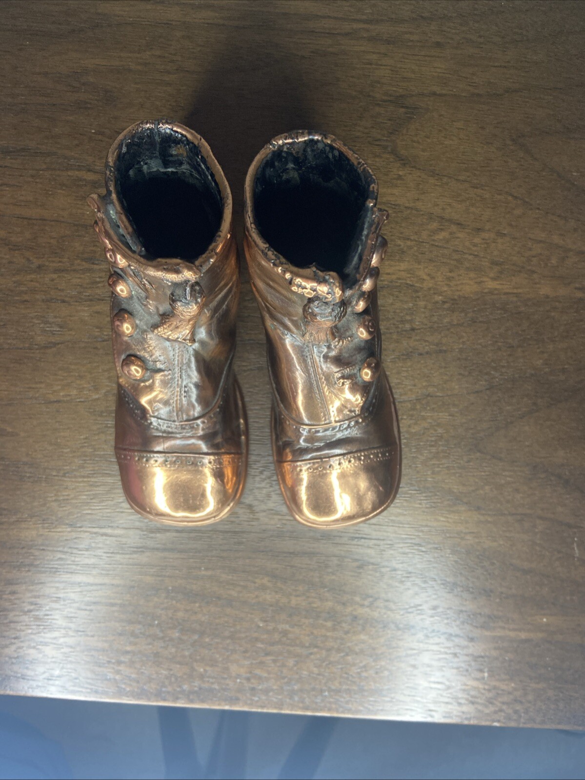 • Antique Vintage Bronzed Victorian Baby Child Shoes High top Button Up Pair