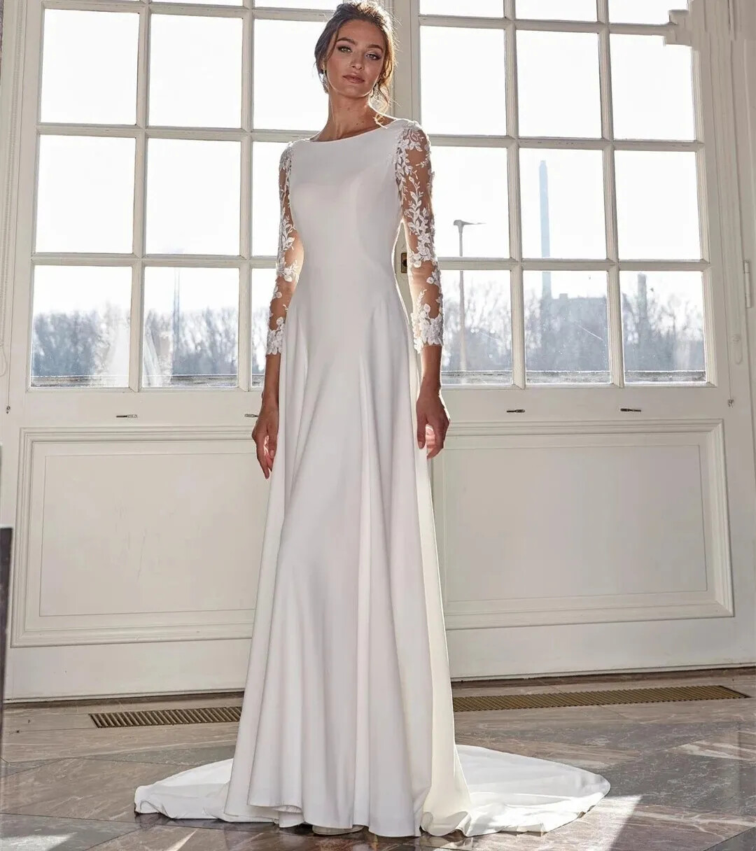 как выглядит Elegant A Line Satin Wedding Dresses Sheer Back Lace Appliques Bridal Gowns фото