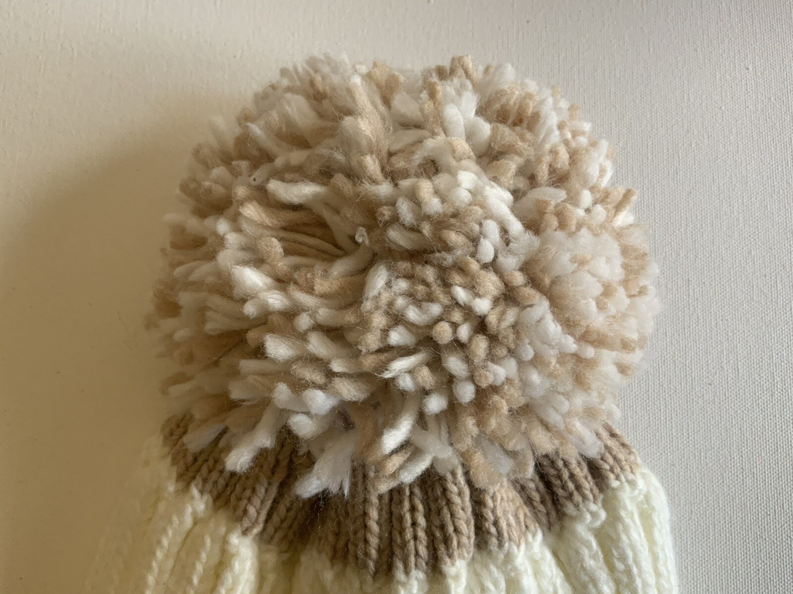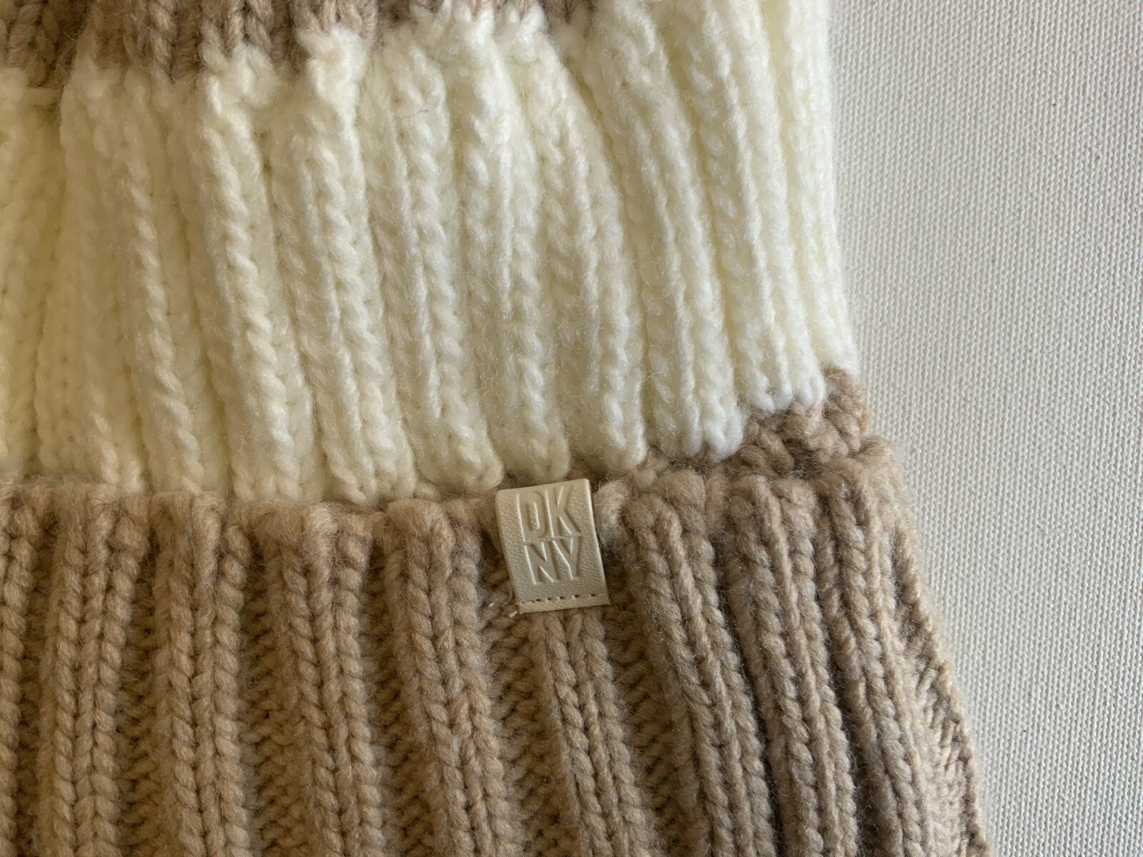 как выглядит DKNY Pom Pom Beanie Hat Ribbed Faux Fur Cream/Beige New фото