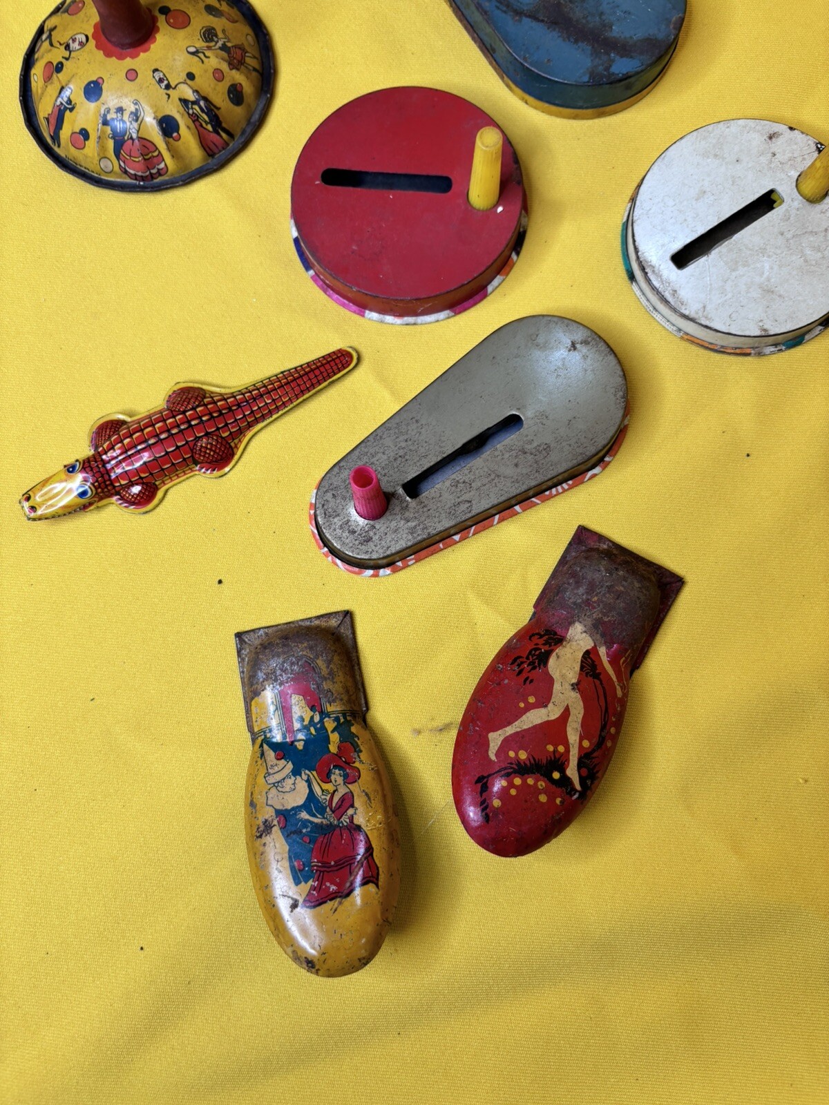 Vintage Lot of 8 Tin Noise Makers Clickers Toys Made In USA Kirchhof.