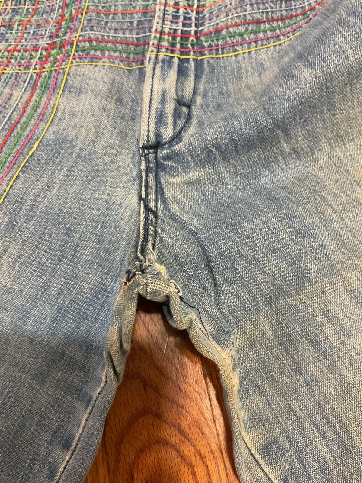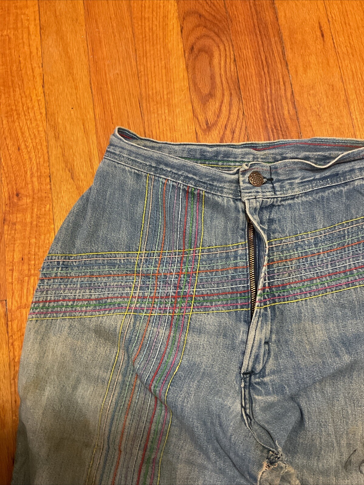 как выглядит VINTAGE 1970S USA MADE HIGH WAIST RAINBOW STITCHED BELL BOTTOM JEANS фото