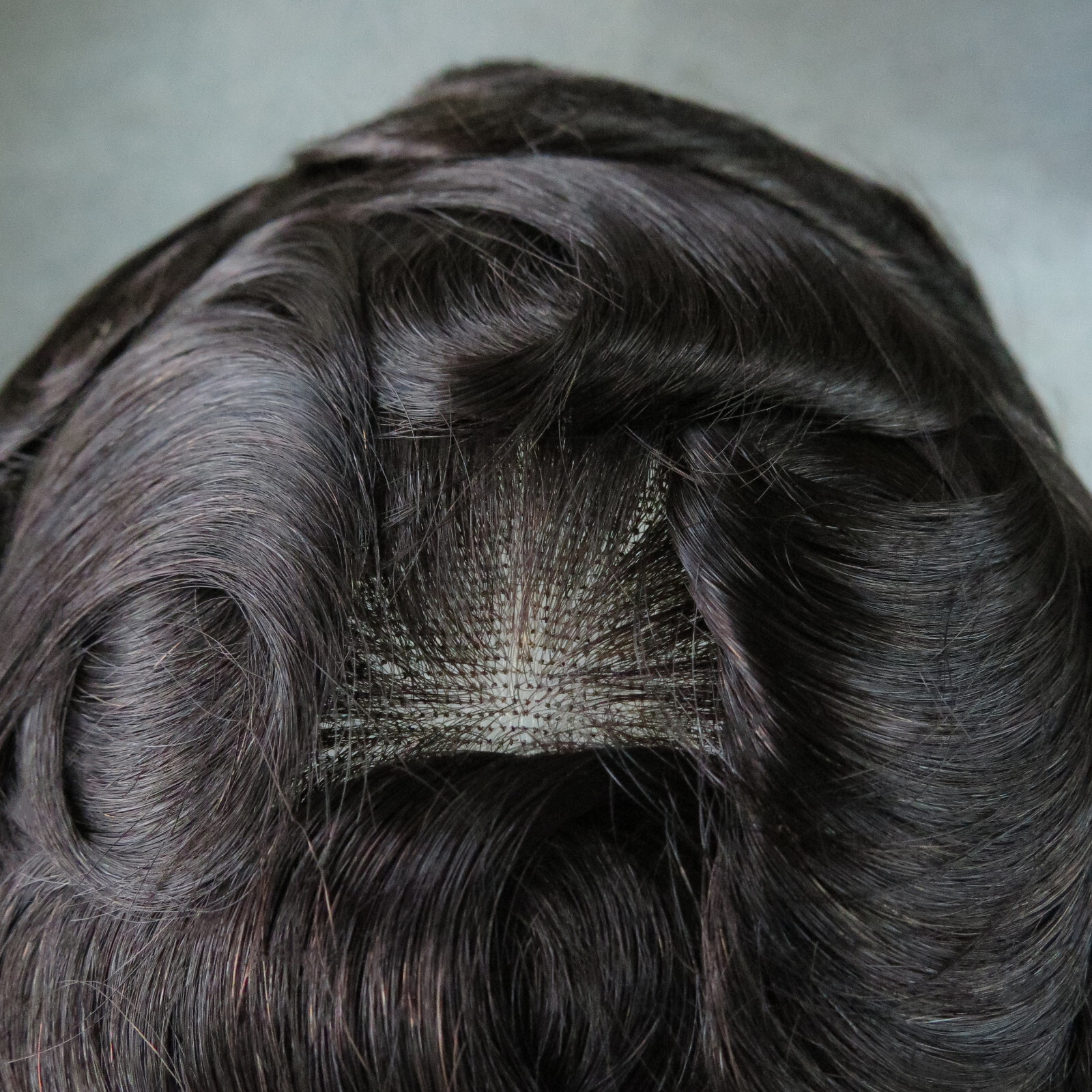 как выглядит Mens Toupee Swiss Lace Human Hair Systems Hairpieces Bleached Hairline 90 1B фото