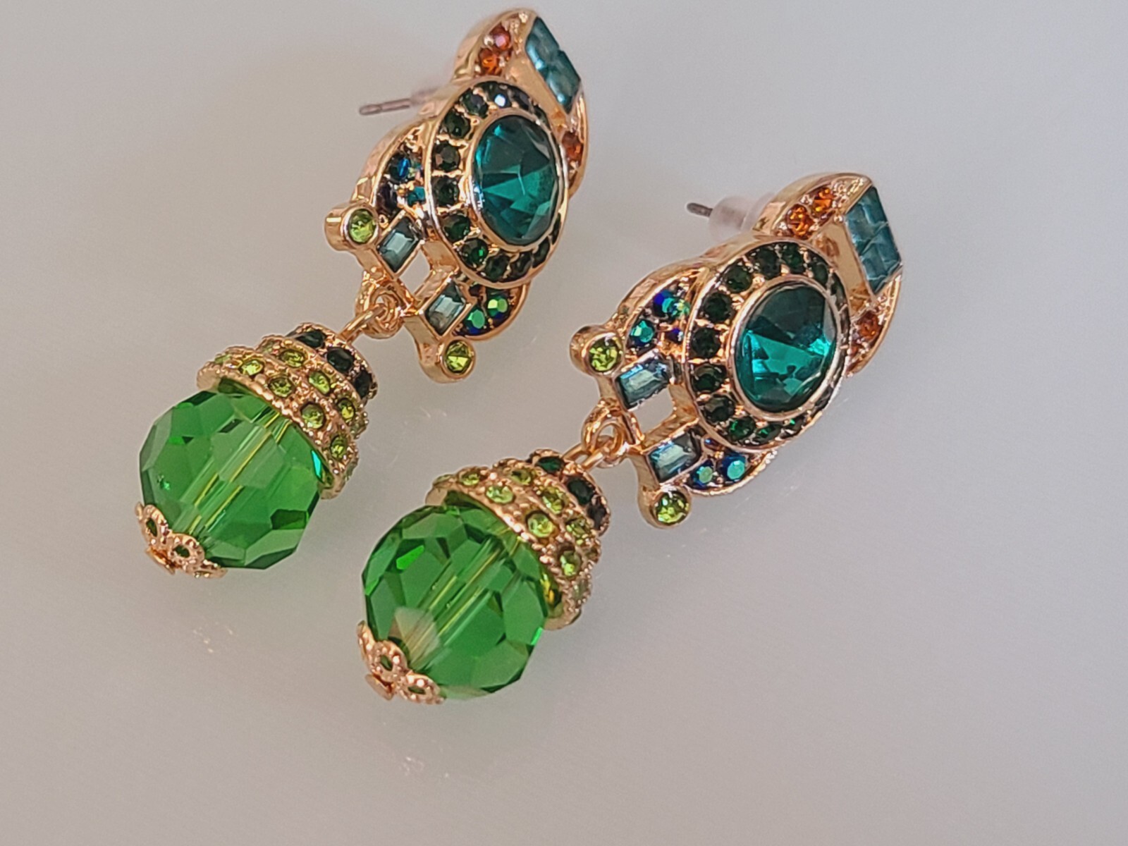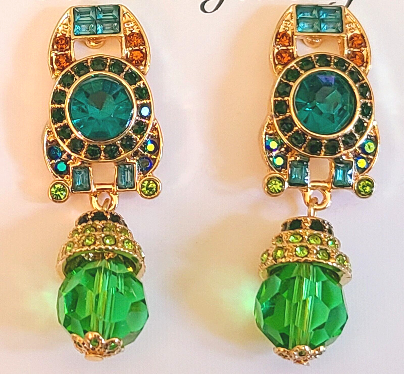 FAB 2 UNSIGNED DESIGNER STYLE ORNATE GREEN CRYSTAL RHINESTONE DANGLE EARRING