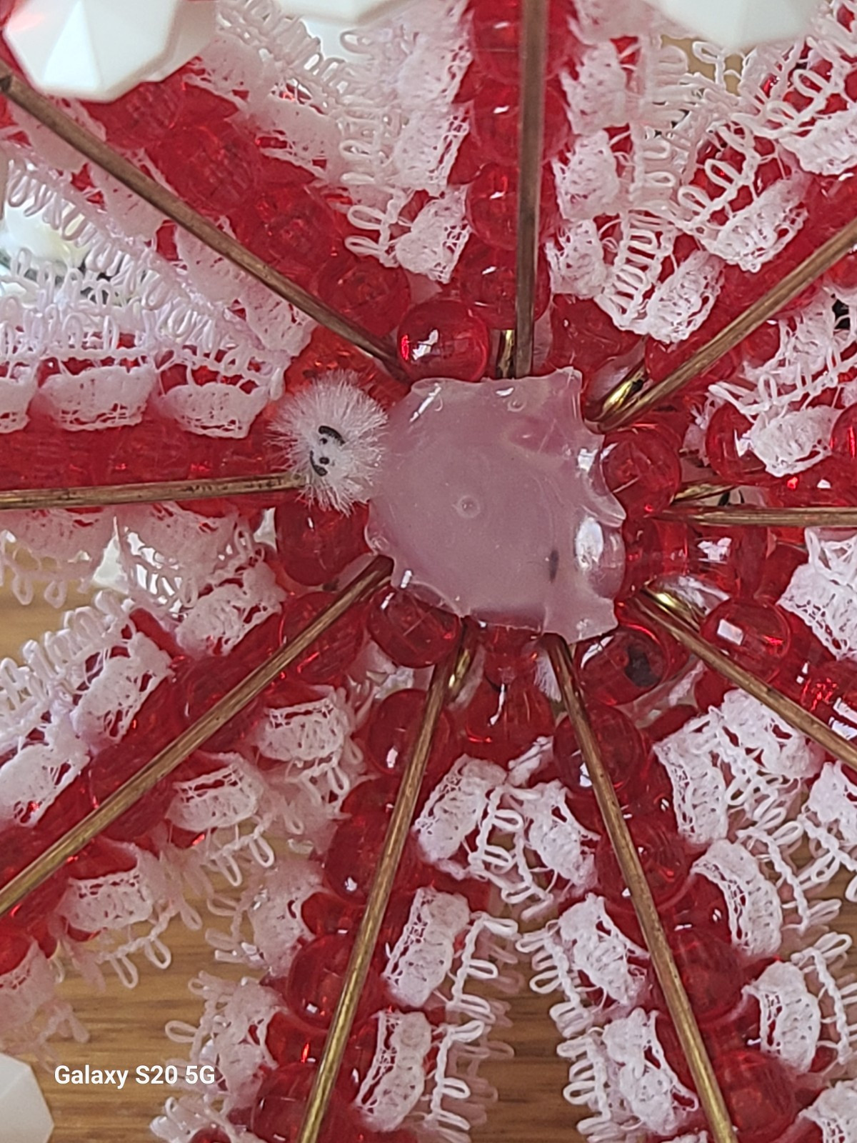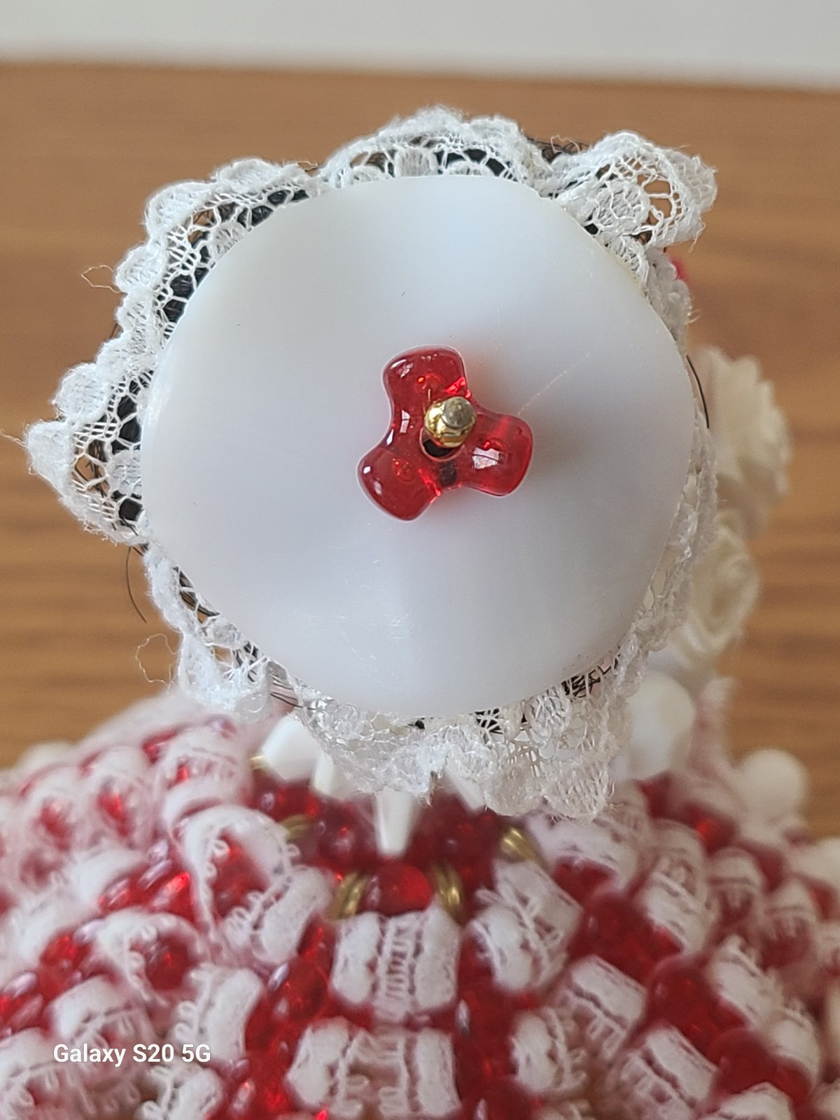 Vintage MCM Beaded Lace Safety Pin Doll Red/White Dress Black Hair Flowers Hat