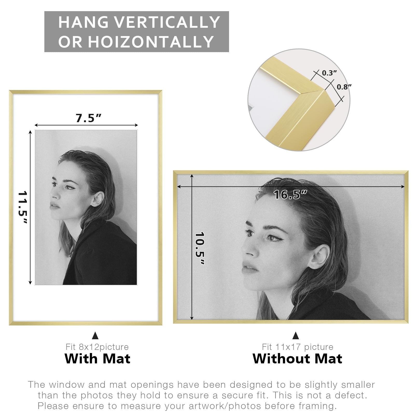 Golden State Art 11x17 Aluminum Picture Frame with Mat for 8x12 Photo or for 11x