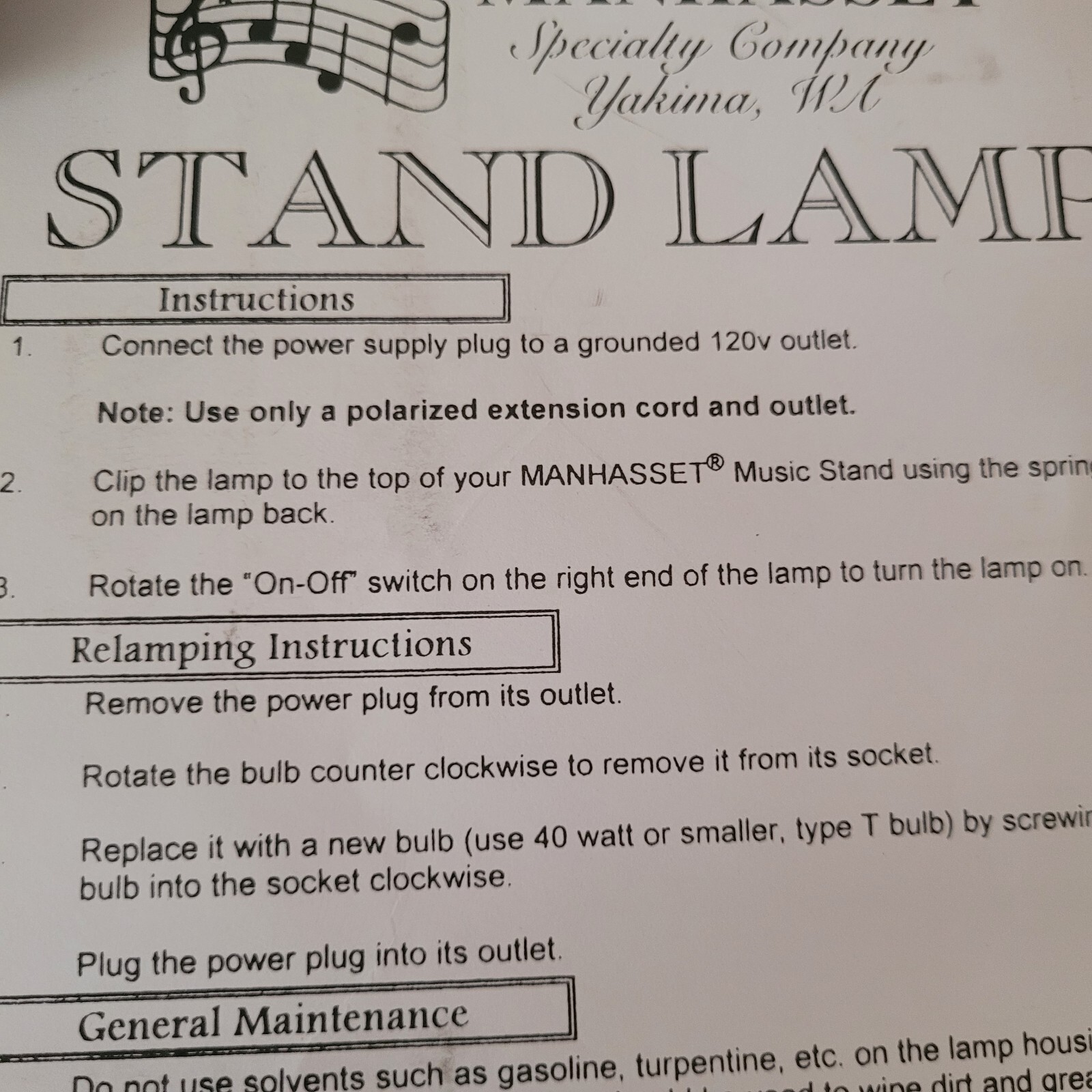 Manhasset 1000 Music Stand Sheet Music Clip Light Lamp