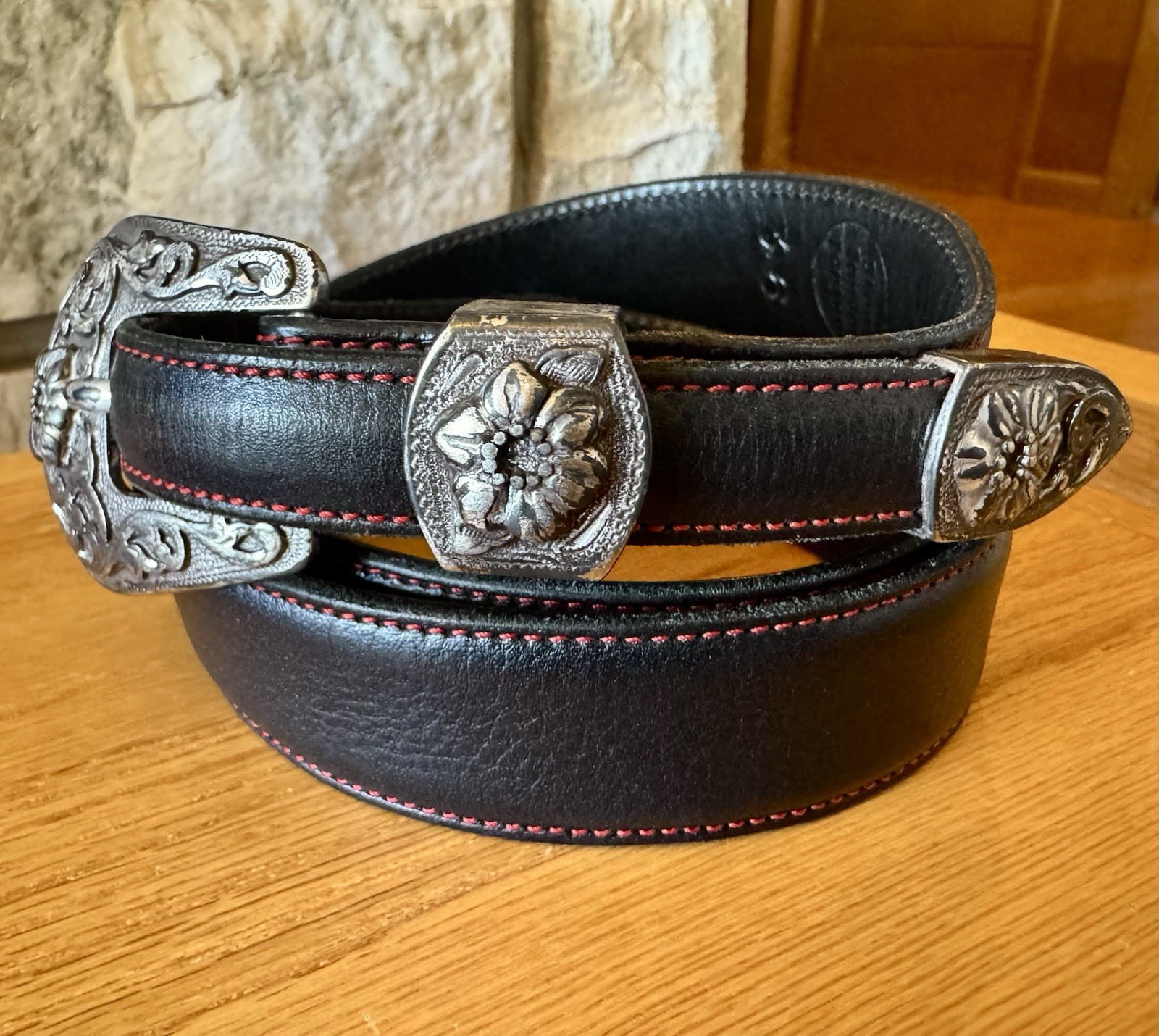 Vintage Bohemian Leather Belt Black Floral Silver Buckle Red Stitching Western