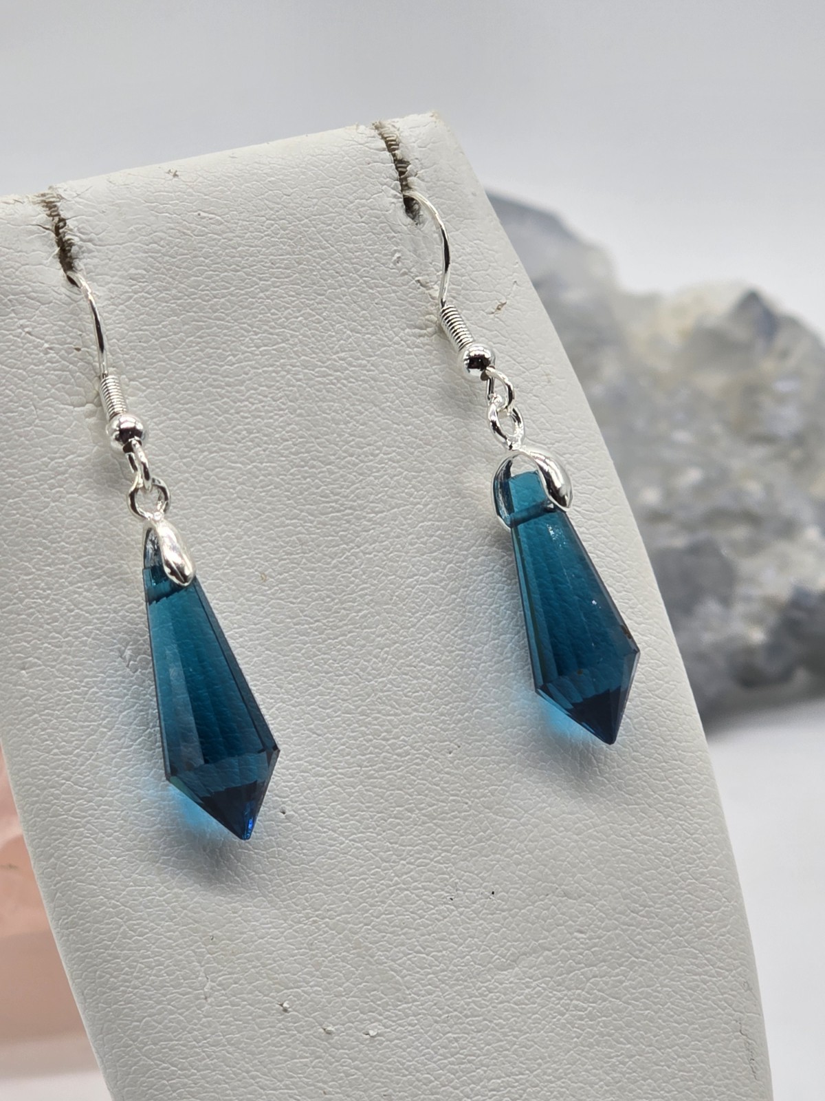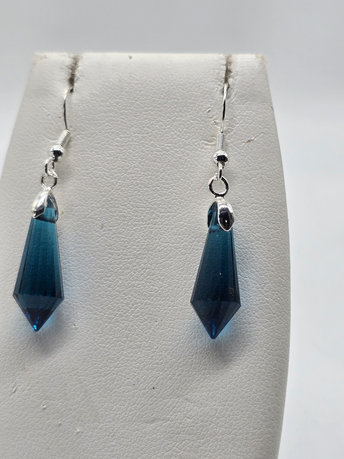 как выглядит Beautiful Sapphire Blue Faceted Point Crystal Sterling Silver Dangle Earrings фото