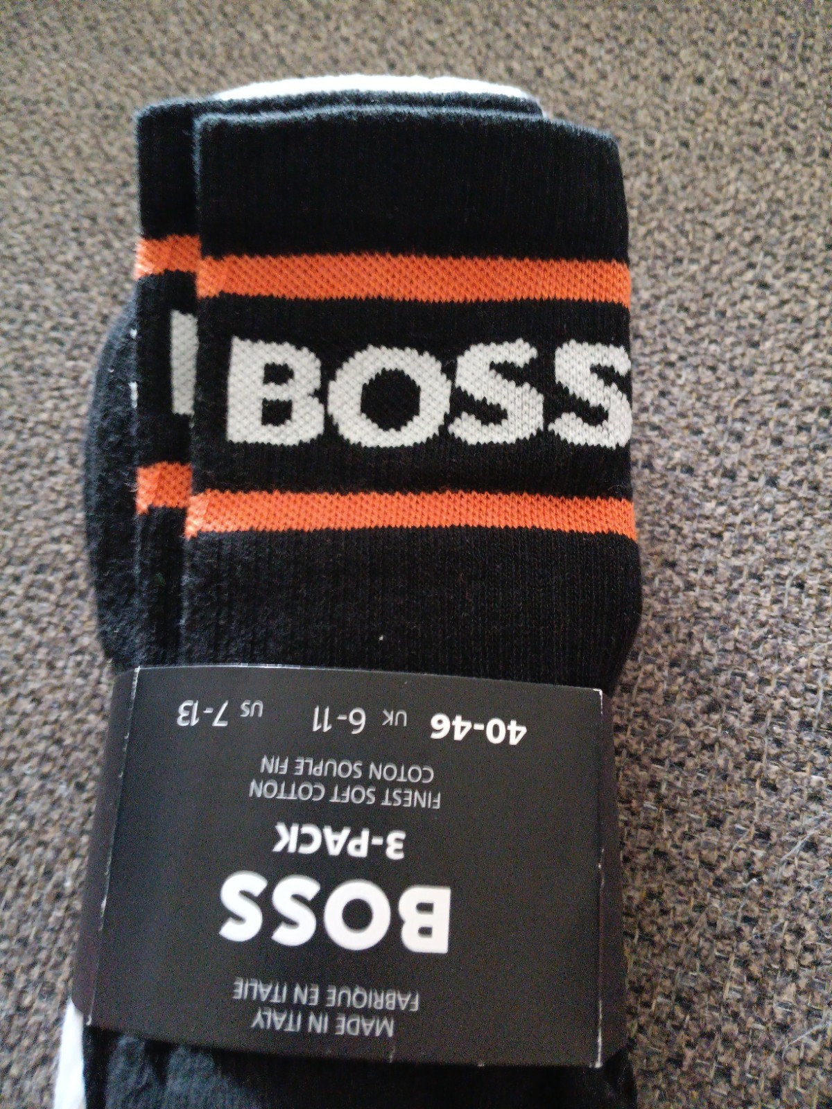 как выглядит NWT HUGO BOSS MENS 3-PACK COTTON CREW SOCKS ITALY BLACK/ ORANGE/ WHITE 7-13 фото