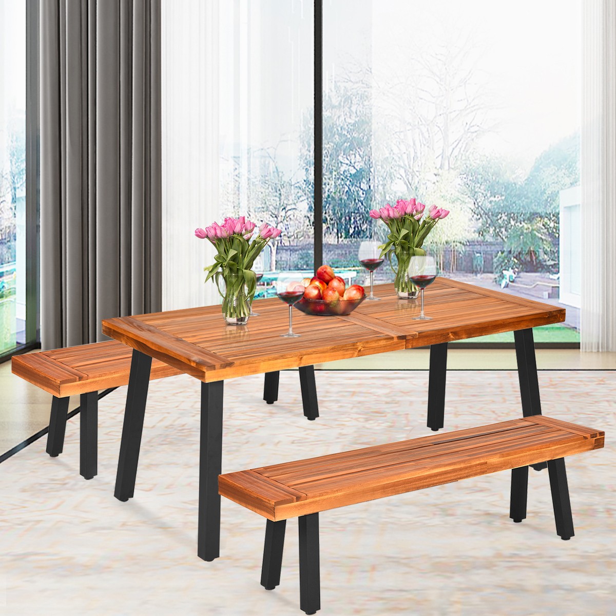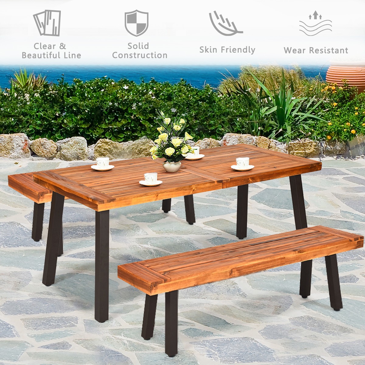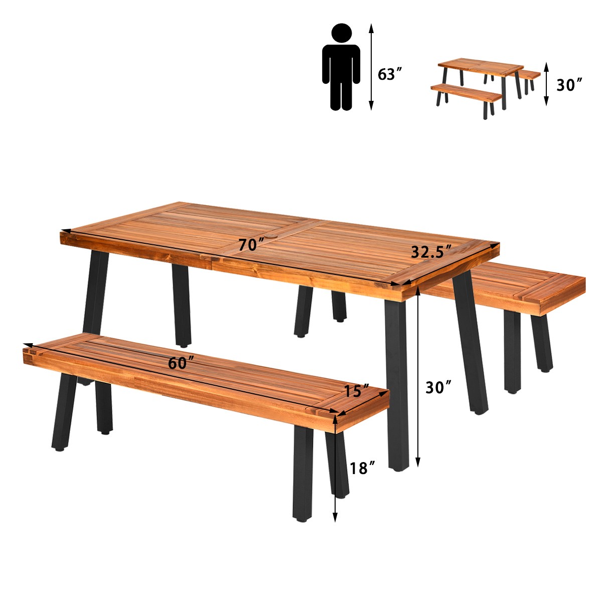3 Pieces Picnic Dining Table Set Acacia Wood Rustic Metal w/Umbrella Hole Brown