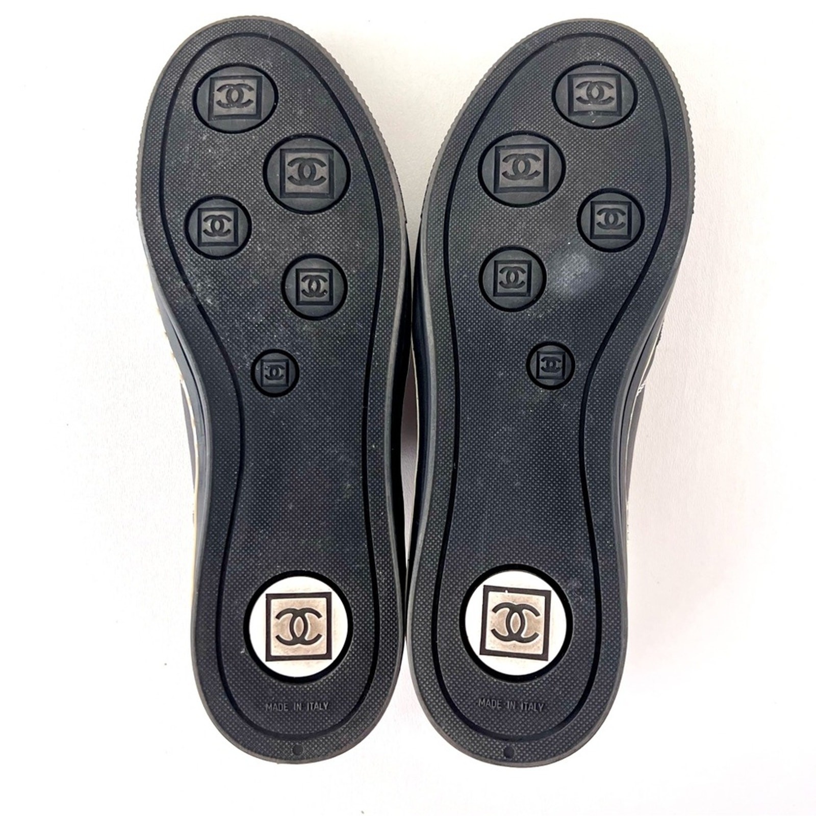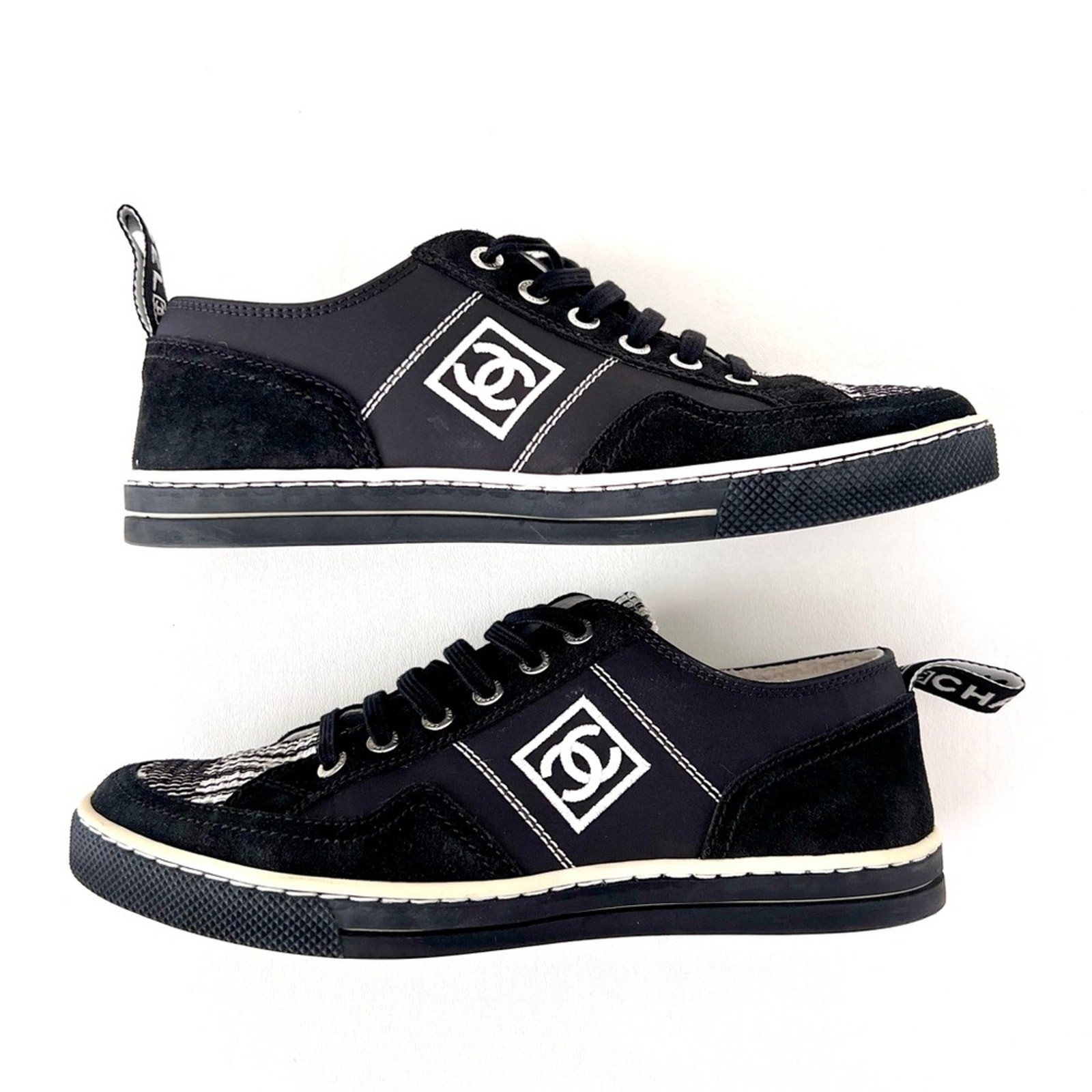 CHANEL Black White Low Top Tennis Sneakers CC Logo Tweed Suede Vintage EU 37