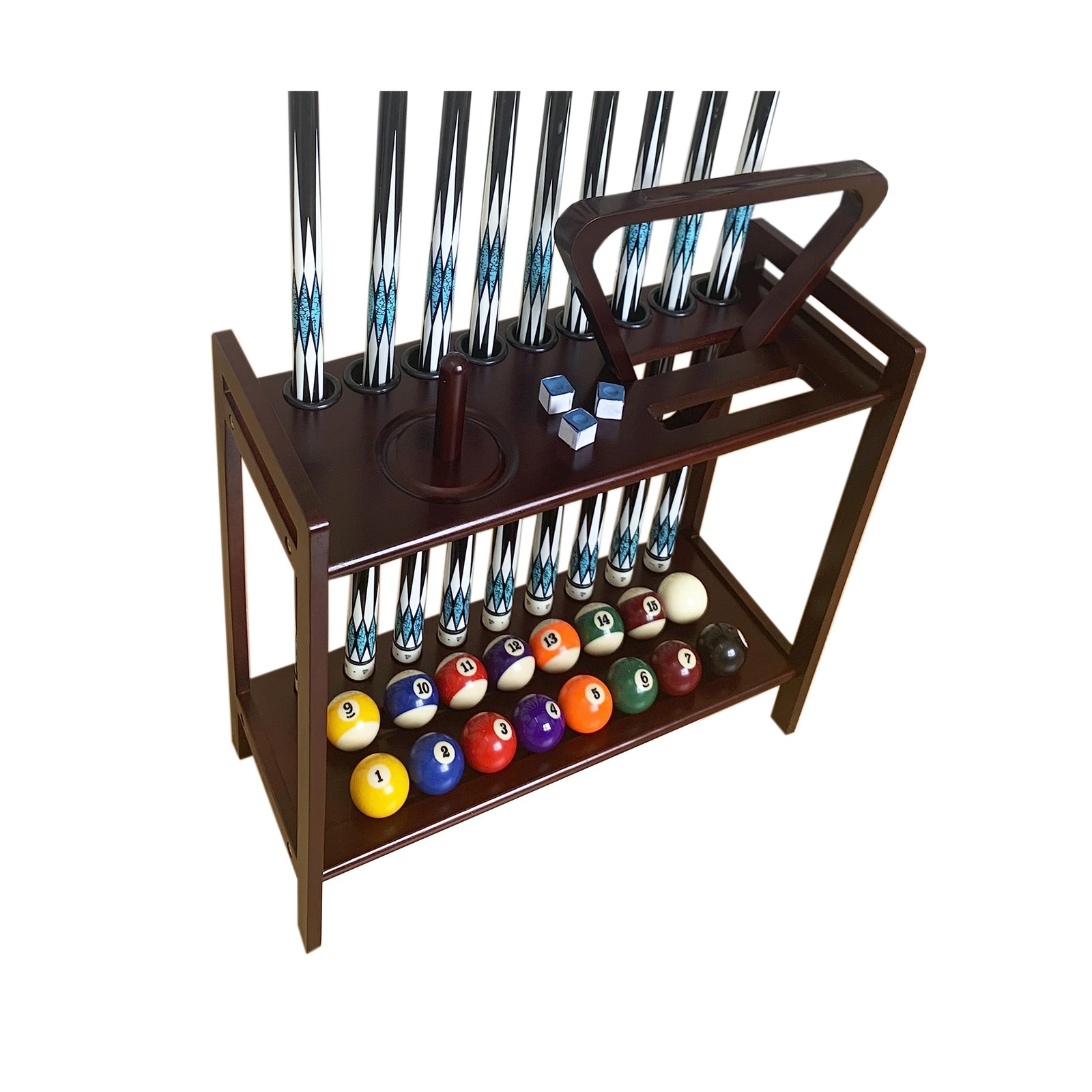 Mahogany Billiard Accessory Holder holds 9 Cues / Ball Set / Ball Racks / Chalk
