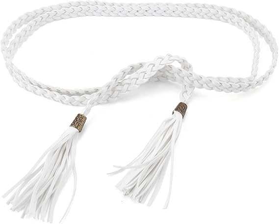 Ayliss Women Tassel Braided Waist Belt Skinny Woven Belt for Dress White