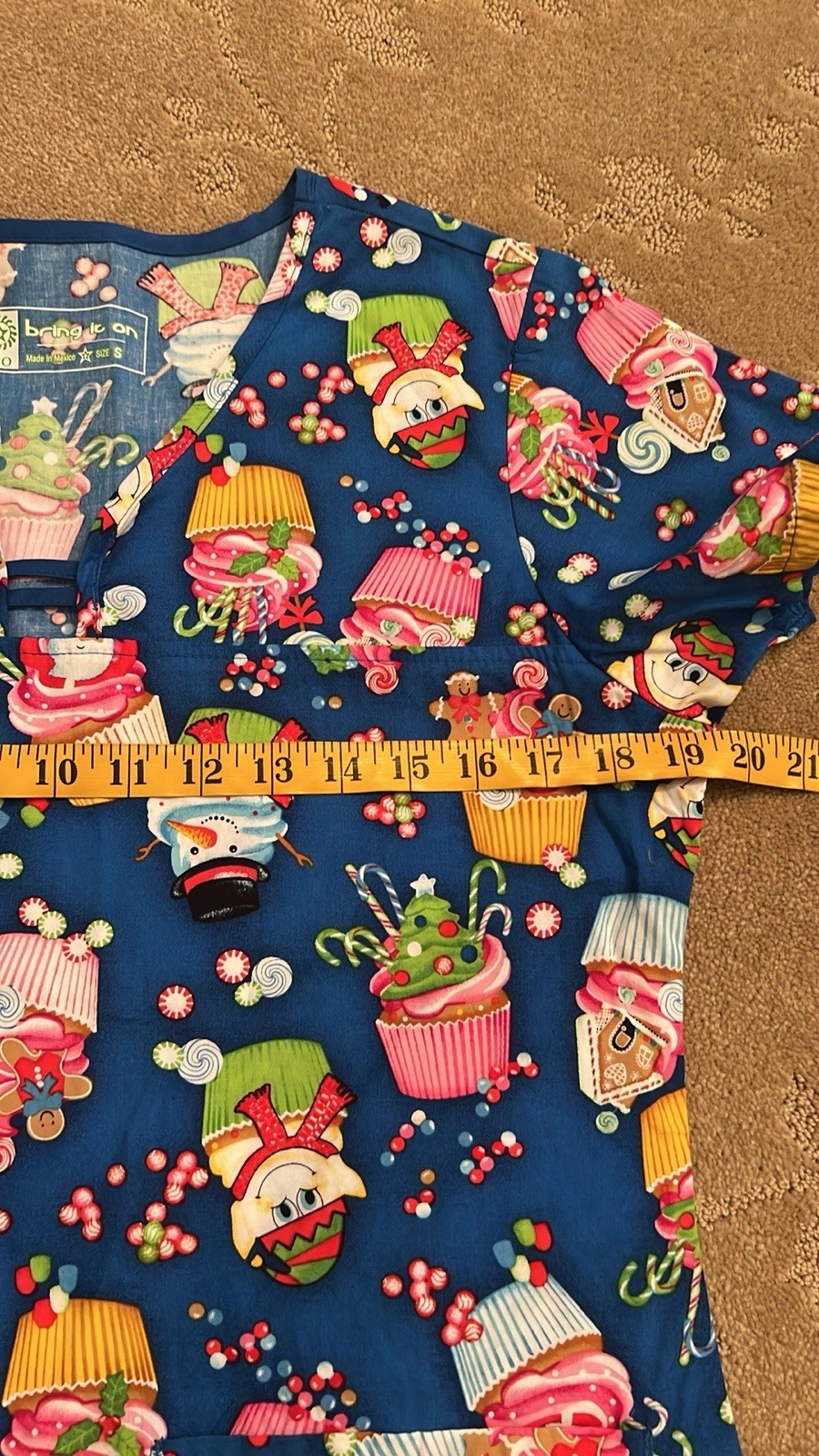 как выглядит Bring It On Women s Christmas Candies Fitted Blue Scrub Top, Small фото