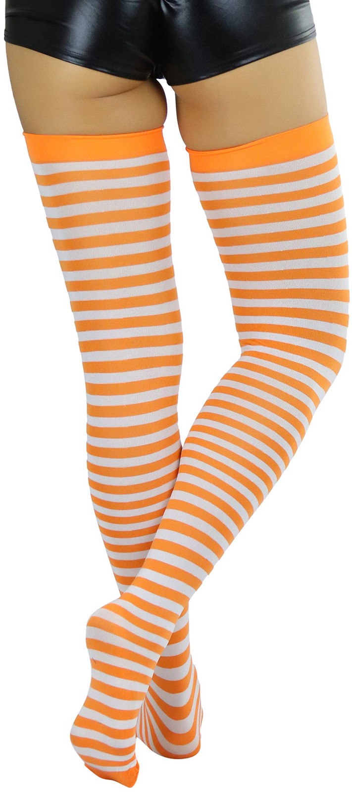 Women s Opaque Hoseiry Thin Striped Thigh High Long Stocking - White W/Orange...