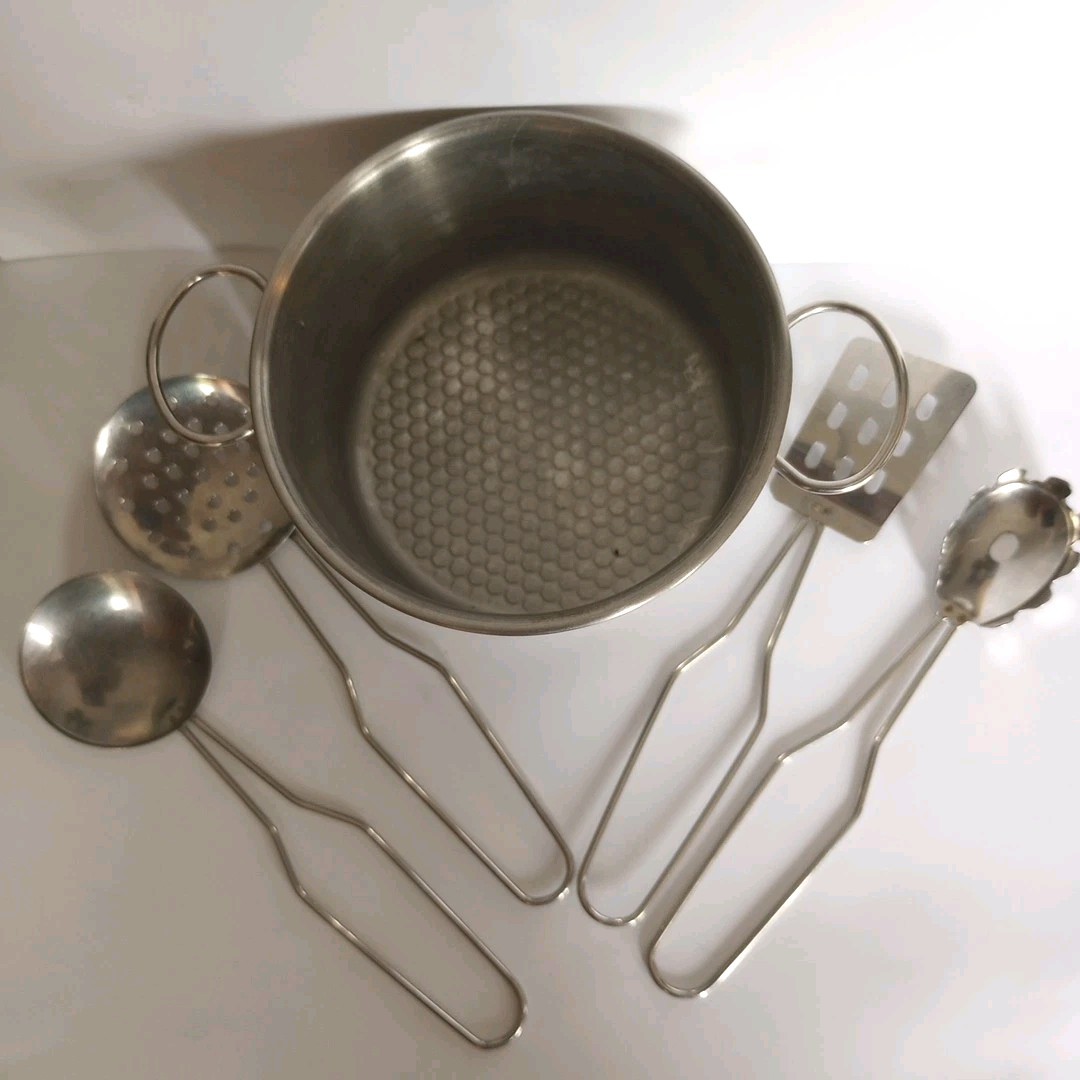 как выглядит Childs Stainless Steel Mini Cooking Pot Toy w 4 Serving Utensils EUC фото