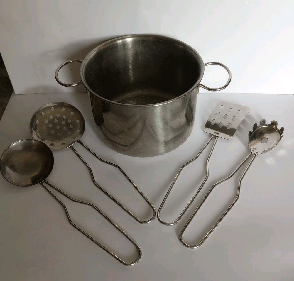 Child's Stainless Steel Mini Cooking Pot Toy w 4 Serving Utensils EUC