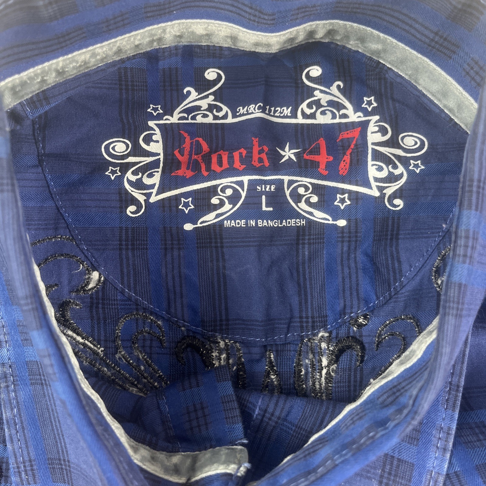 Rock 47 Wrangler Embroidered Shirt Mens Large Blue Plaid Pearl Snap Short Sleeve