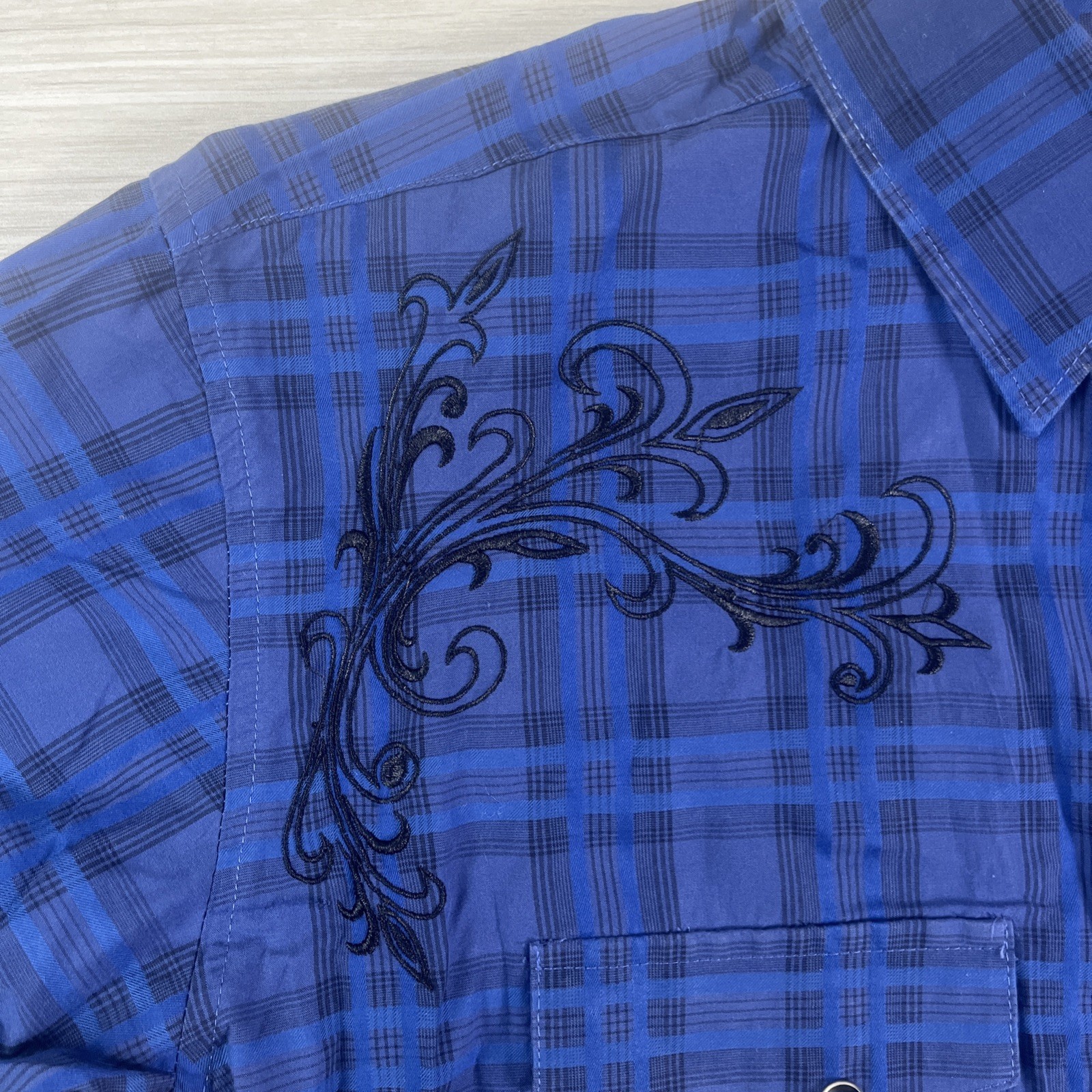 как выглядит Rock 47 Wrangler Embroidered Shirt Mens Large Blue Plaid Pearl Snap Short Sleeve фото