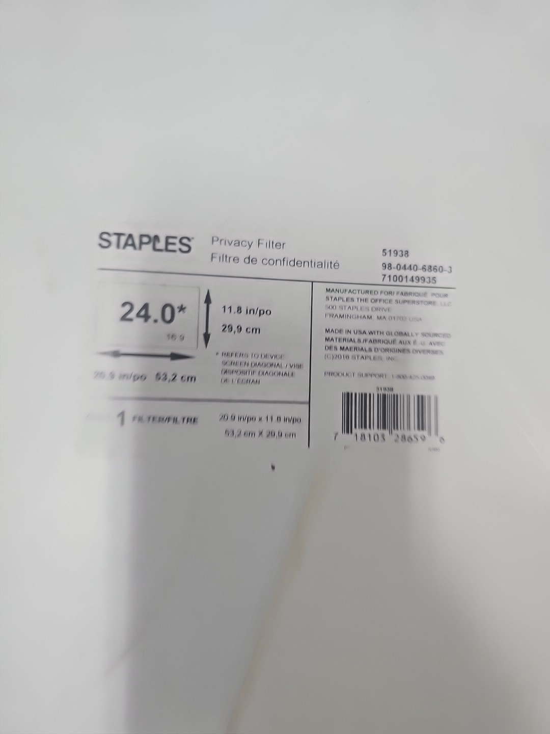 Staples Privacy Filter 24 In. 11.8 x 20.9 Inches Black Open Box