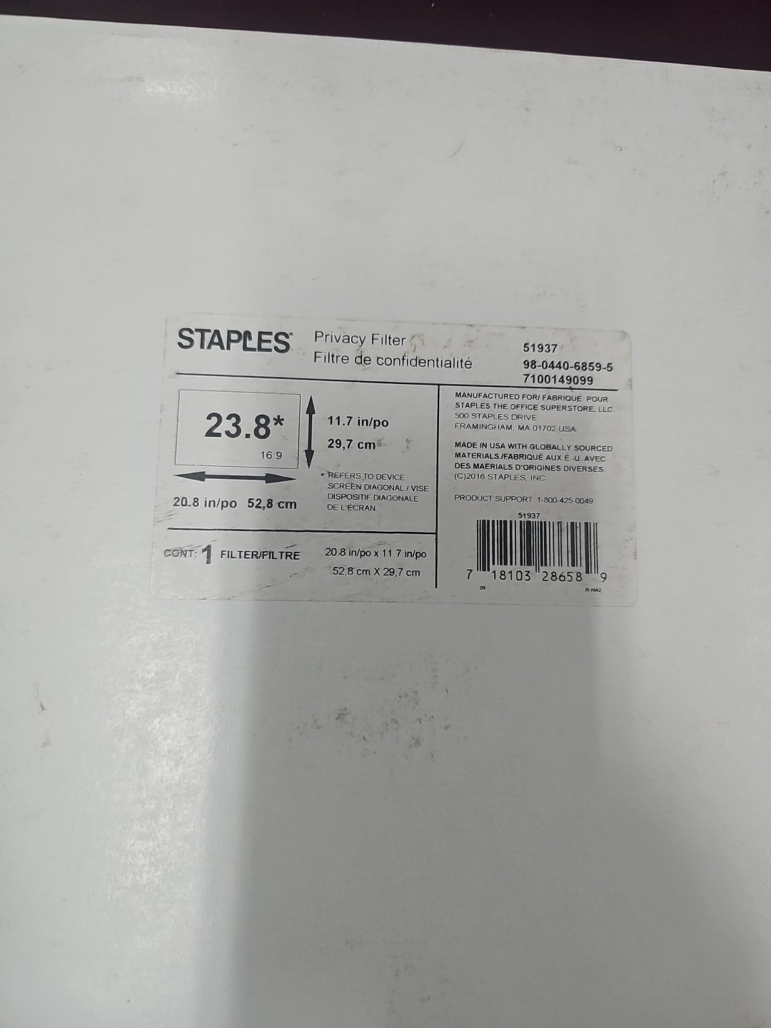 как выглядит Staples Privacy Filter for 23.8" Monitor 11.7in X 20.8 In Open Box 51937 фото