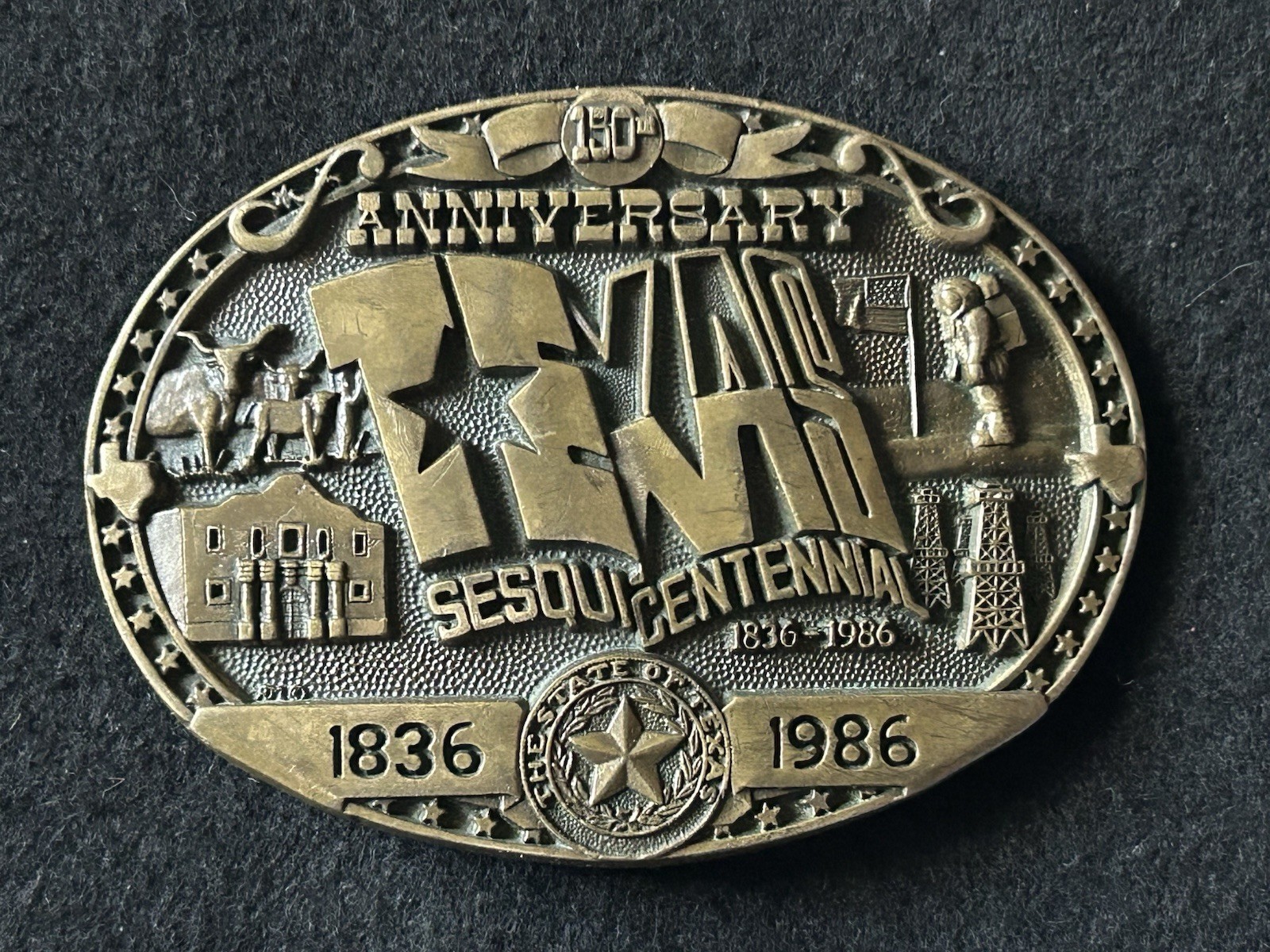 как выглядит Vintage Texas Sesquicentennial Solid Brass Belt Buckle Limited Award Design 1986 фото