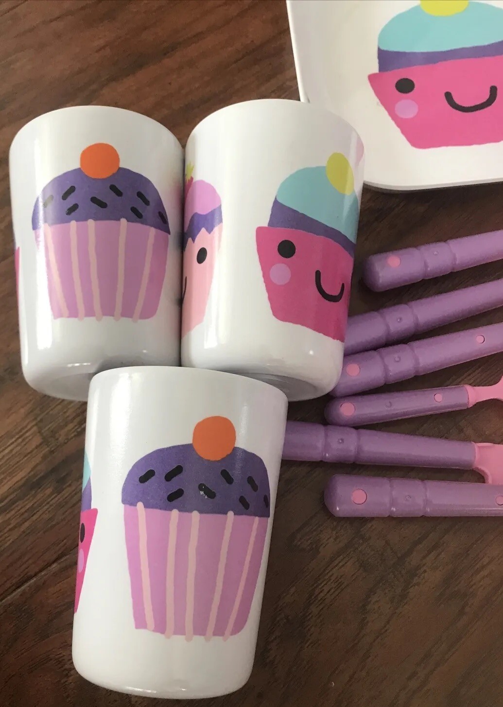 Kids Pretend Play Plastic Cup Dish and Utensil Dinnerware Cupcake Disney 28 Pcs
