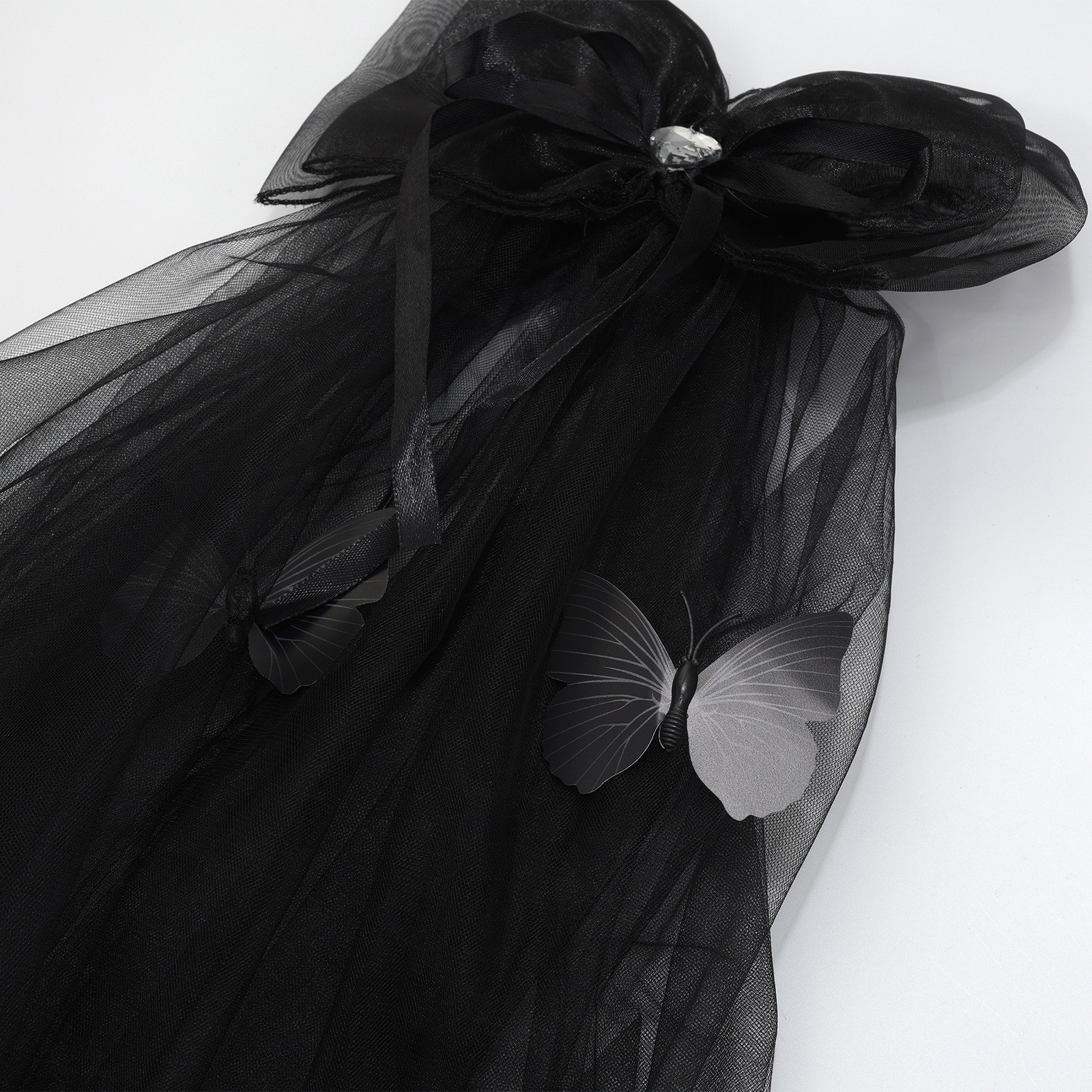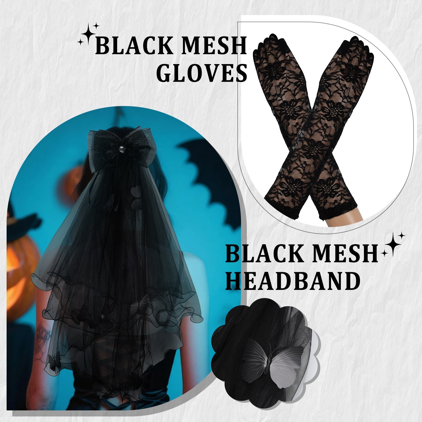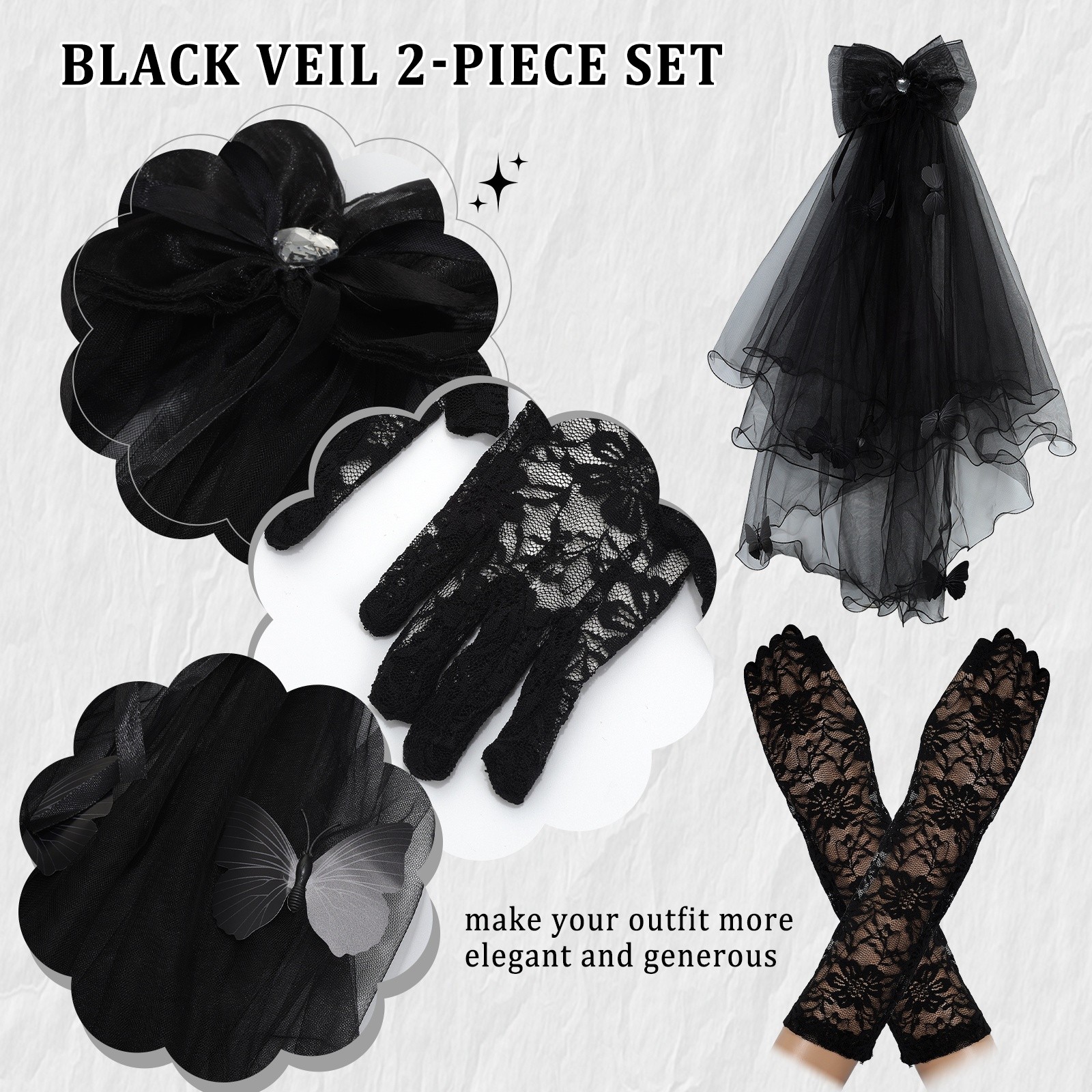 2PCs Women Elegant Gothic Black Veil Gloves Set for Halloween Funeral Wedding