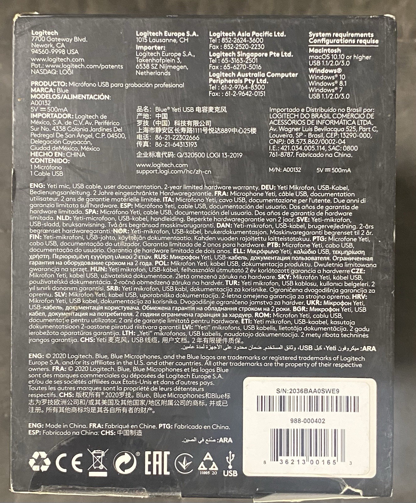 Blue Yeti USB Blue Microphone With Box With Power Cord