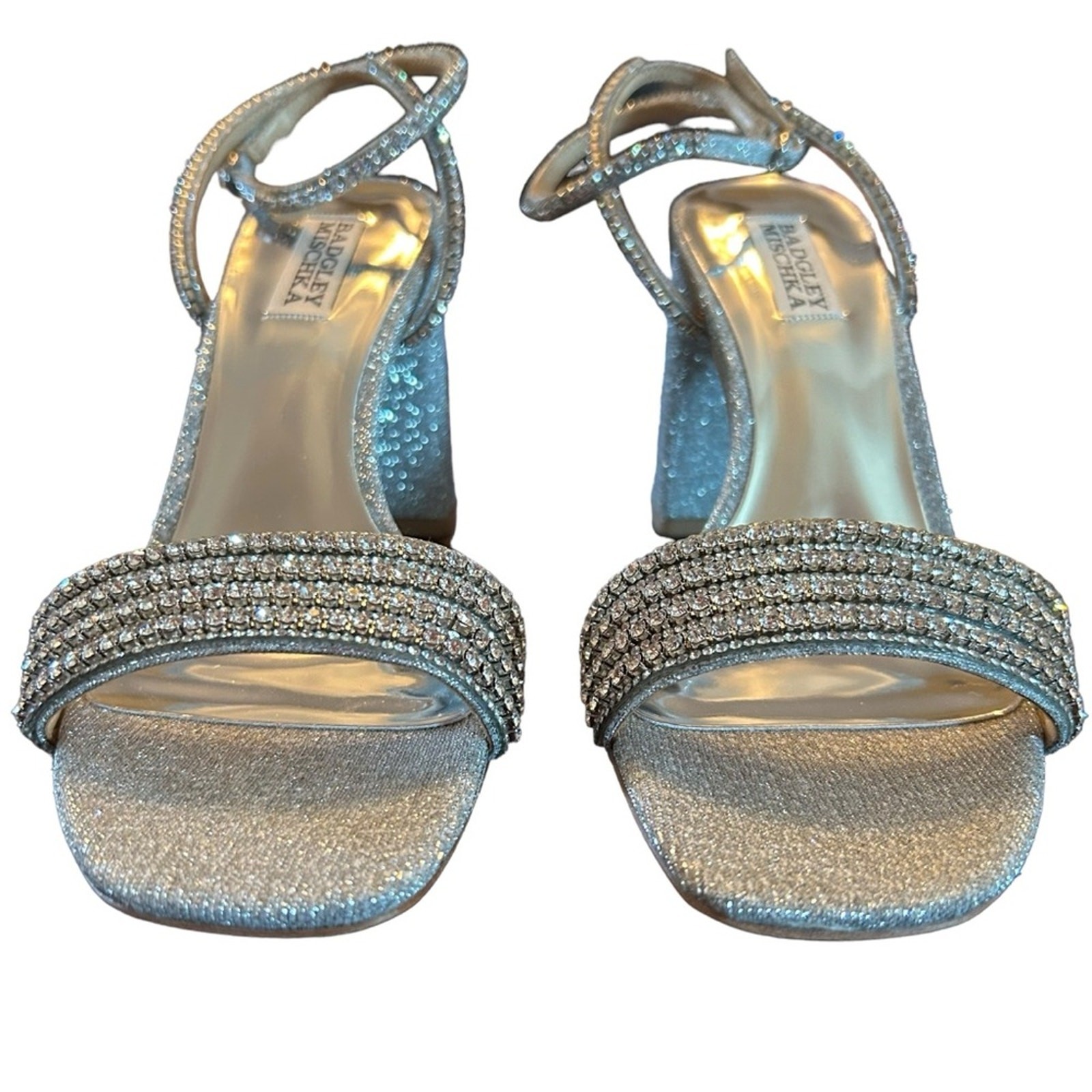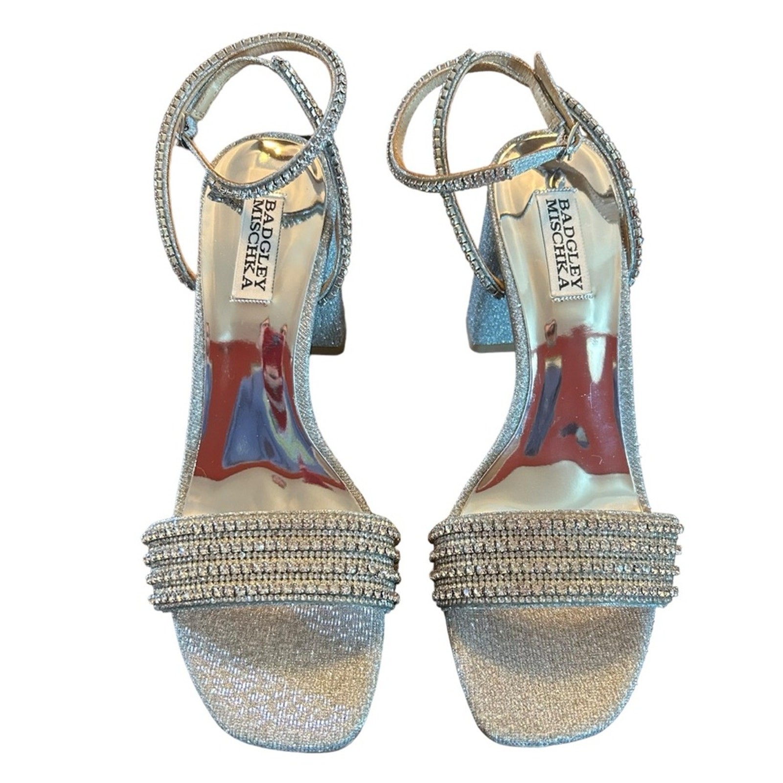 как выглядит Badgley Mischka Becca Strappy Block Heels Silver Metallic Rhinestone NEW Size 7 фото
