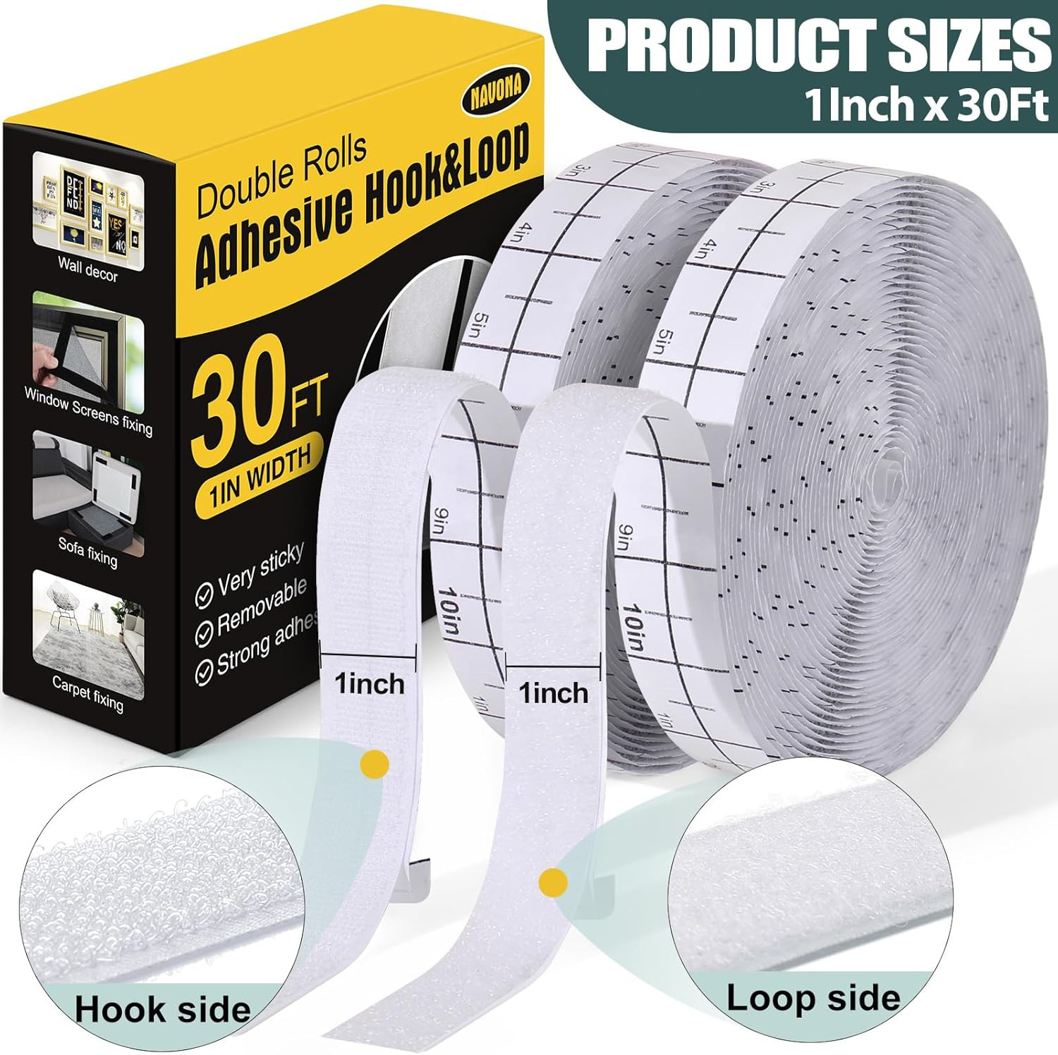 30Ft X 1 Inch Hook and Loop Strips with Adhesive 2 Rolls Heavy Duty Hook and L