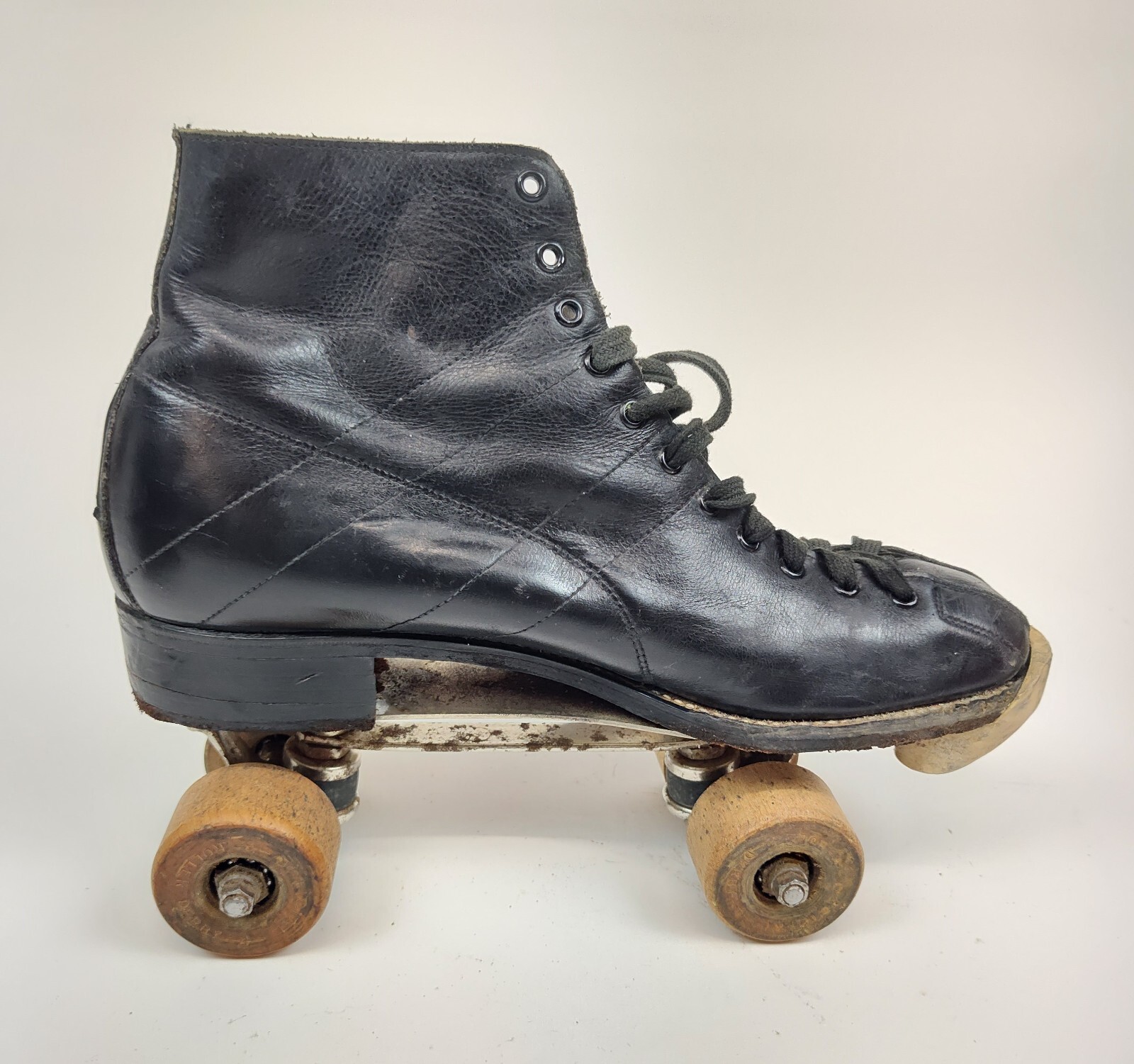 Vintage Official Roller Derby Skates Wood Wheels, Black Size 10 With Metal Case