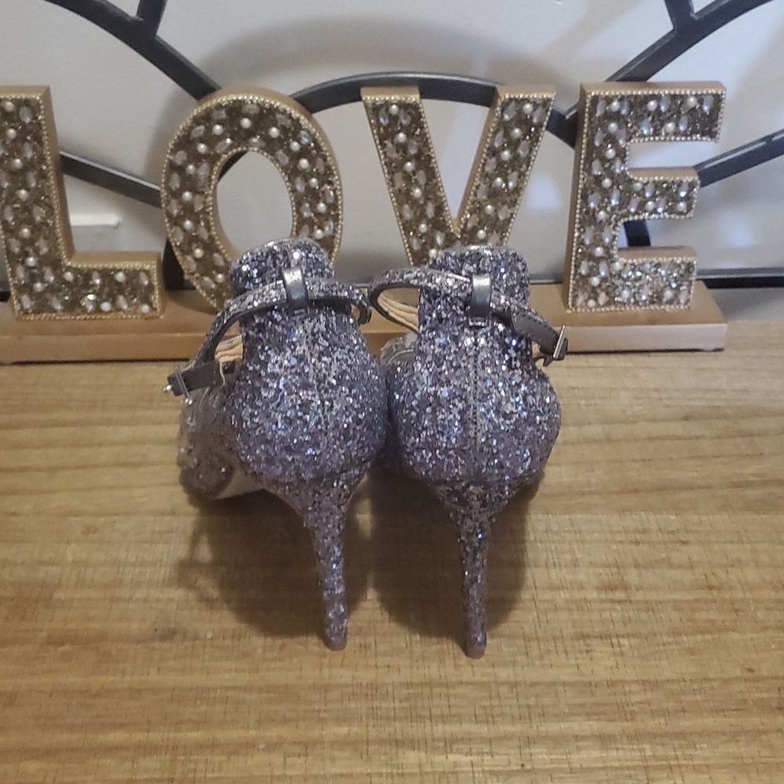 как выглядит Jewel Badgley Mischka Conroy Metallic Glitter Evening Shoe Sz 9 Smoke Glitter фото