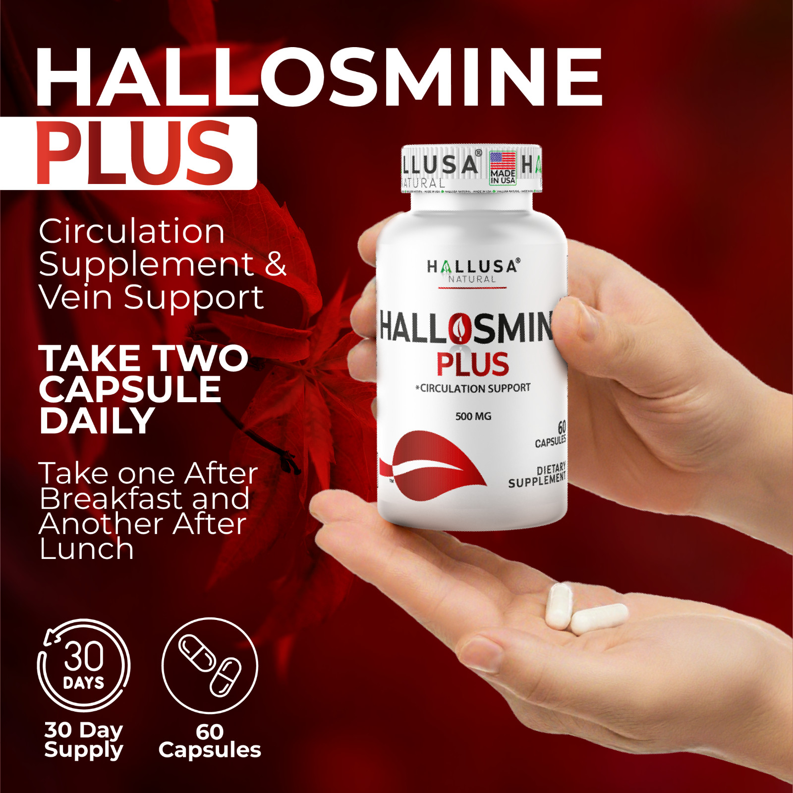 Hallusa Natural Hallosmine Plus 500mg Diosmin Circulation Vein Support 60 caps
